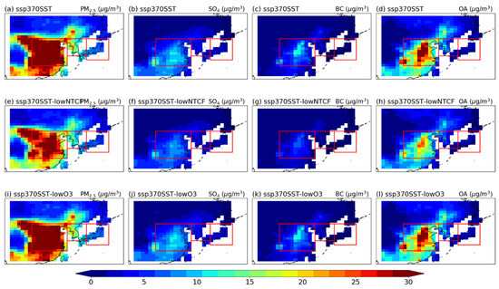 Spatial distribution of annual mean surface PM2.5 concentrations (first column) and their major components (SO4, second column; BC, third column; and OA, fourth column) from the ssp370SST (a–d, top row), ssp370SST-lowNTCF (e–h, middle row), and ssp370SST-lowO3 (i–l, bottom row) experiments for the present-day period (1995–2014). Red squares indicate the EC, KO, and JP regions from left to right.