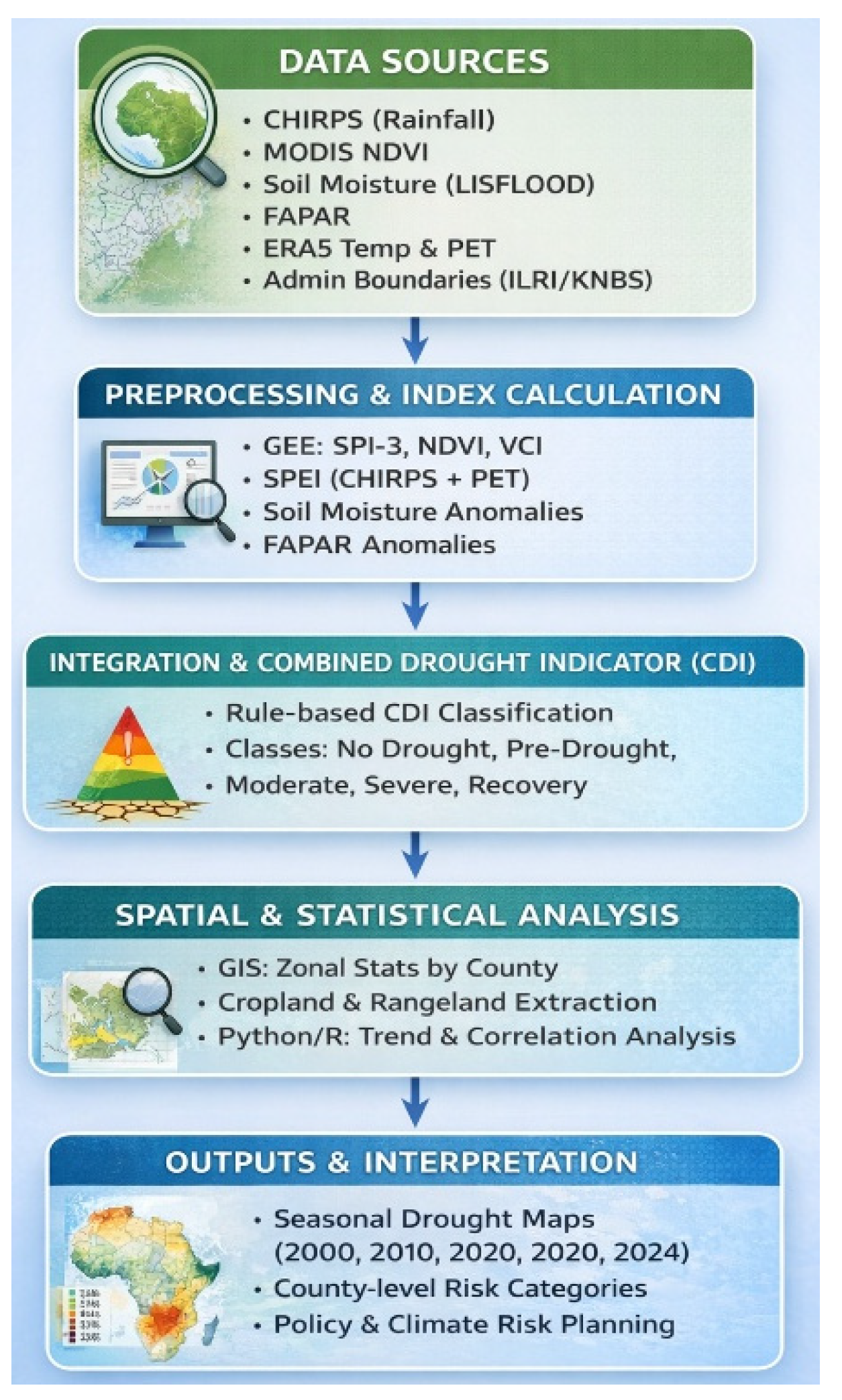 For spatial disaggregation and contextualization, administrative boundary data for Kenya’s counties were obtained from the International Livestock Research Institute (ILRI) and the Kenya National Bureau of Statistics (KNBS). These shapefiles facilitated precise mapping of drought severity across administrative units. To validate the satellite-derived indicators and ensure alignment with on-the-ground impacts, the study incorporated drought bulletins and situational reports from the National Drought Management Authority (NDMA). These reports served as ground truth references to assess the consistency of remotely sensed signals with observed drought occurrences, thereby enhancing the credibility and operational relevance of the analysis. A summary of all datasets used in the study is presented in