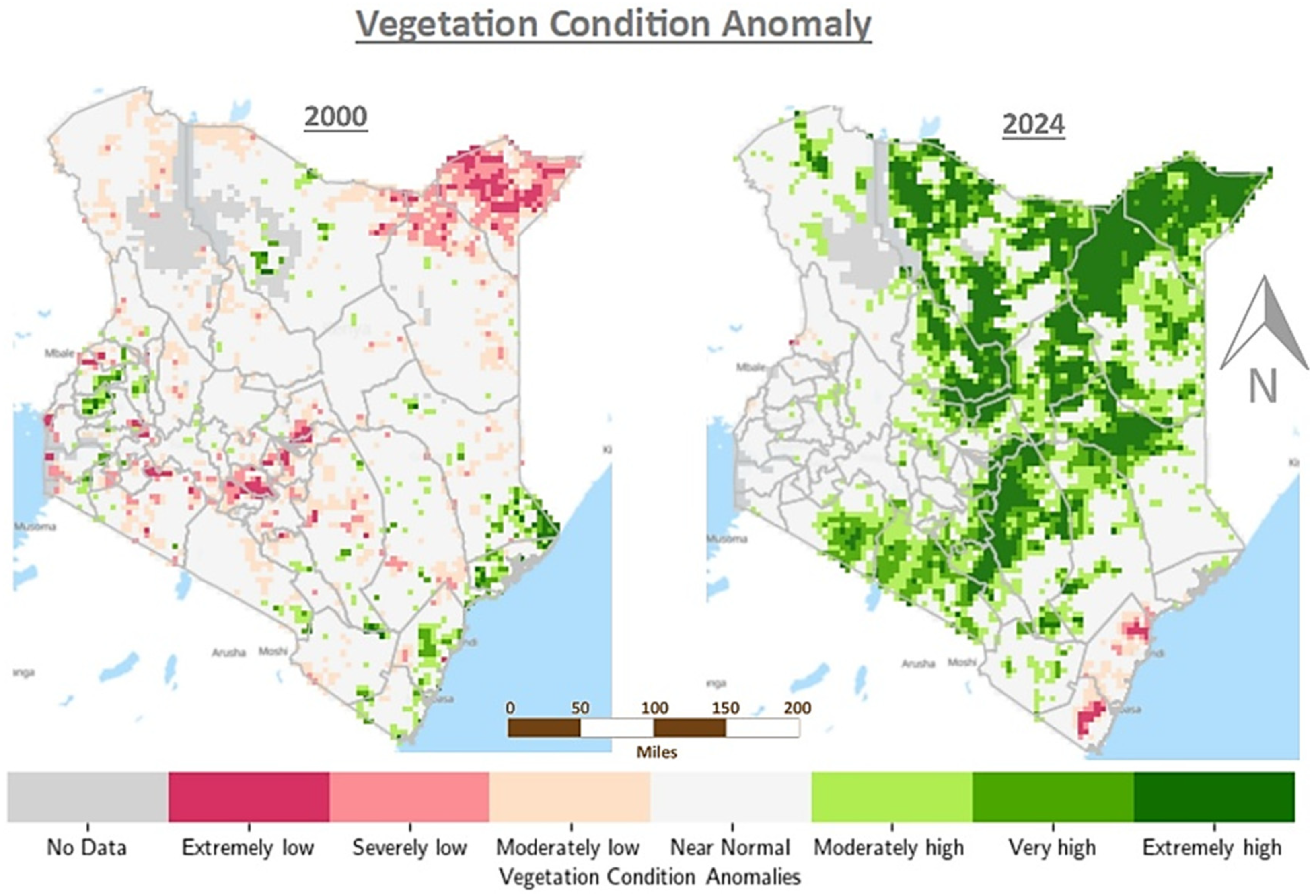 15]. However, the northern and eastern ASAL counties, such as Turkana, Wajir, Mandera, and Garissa, often receive less than 500 mm of rainfall annually, making them hotspots for recurrent drought events [