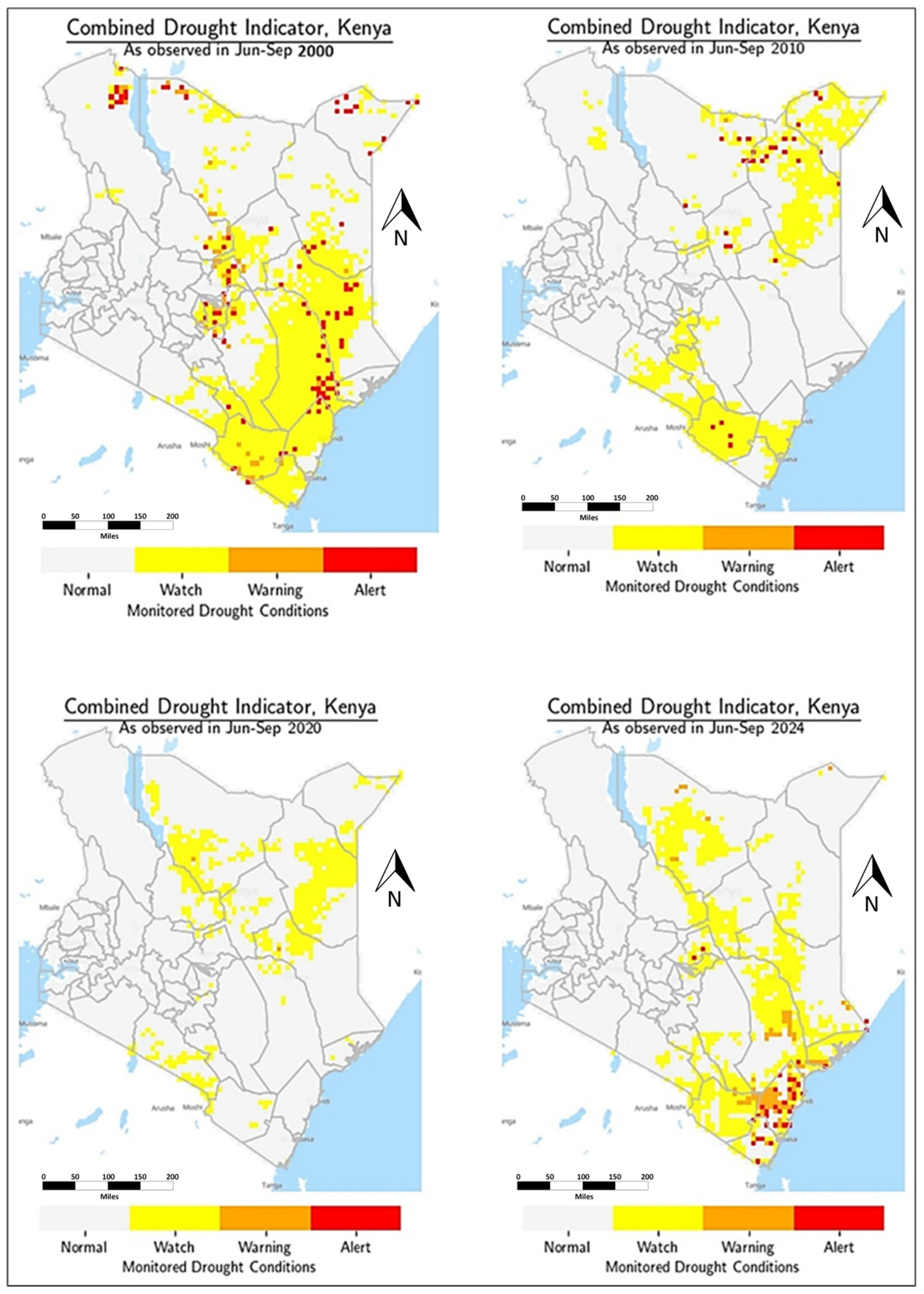 This study provides a comprehensive spatiotemporal assessment of drought occurrence and severity in Kenya by integrating multiple remote sensing indices, SPEI, VCI, SMA, and FAPAR, into the Combined Drought Indicator (CDI). By focusing on the JJAS seasons of 2000, 2010, 2020, and 2024, the analysis captures both historical and projected drought dynamics at the subnational scale, offering new insights into Kenya’s evolving hydroclimatic risks. The CDI improves upon single-indicator approaches by simultaneously accounting for meteorological deficits, soil moisture anomalies, and vegetation stress, thereby reducing uncertainty and enhancing policy relevance.