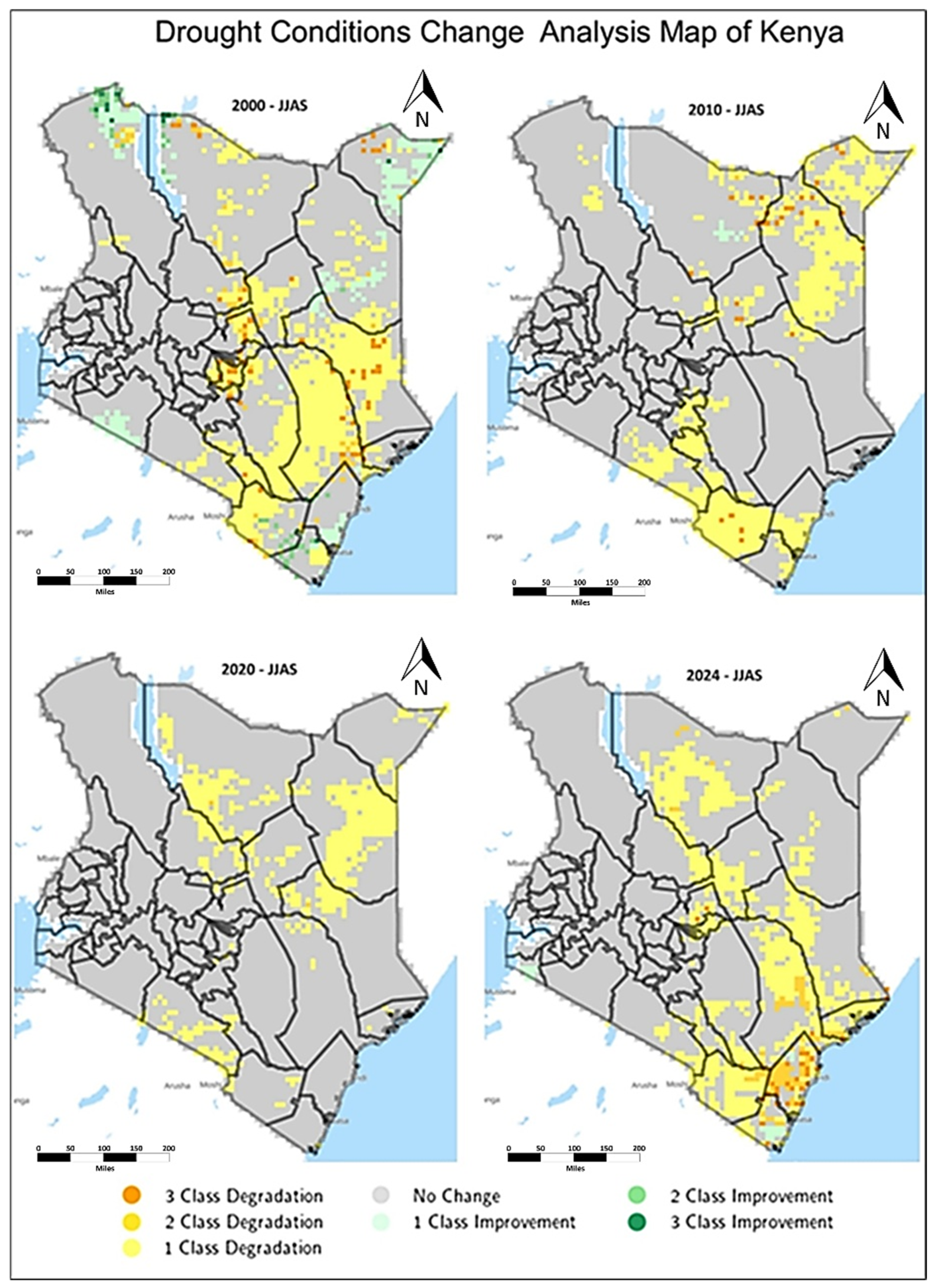 This study employs an integrated remote sensing and geospatial approach to monitor and map seasonal drought occurrence across Kenya using multi-source satellite-derived drought indices. The methodology combines precipitation anomalies, soil moisture dynamics, and vegetation condition indicators into a harmonized framework for assessing drought severity and persistence. The analysis focused on the June–September (JJAS) season for the period 2000–2024 (2000, 2010, 2020, and 2024), which were selected as temporal milestones to illustrate long-term drought shifts under increasing climate stress.