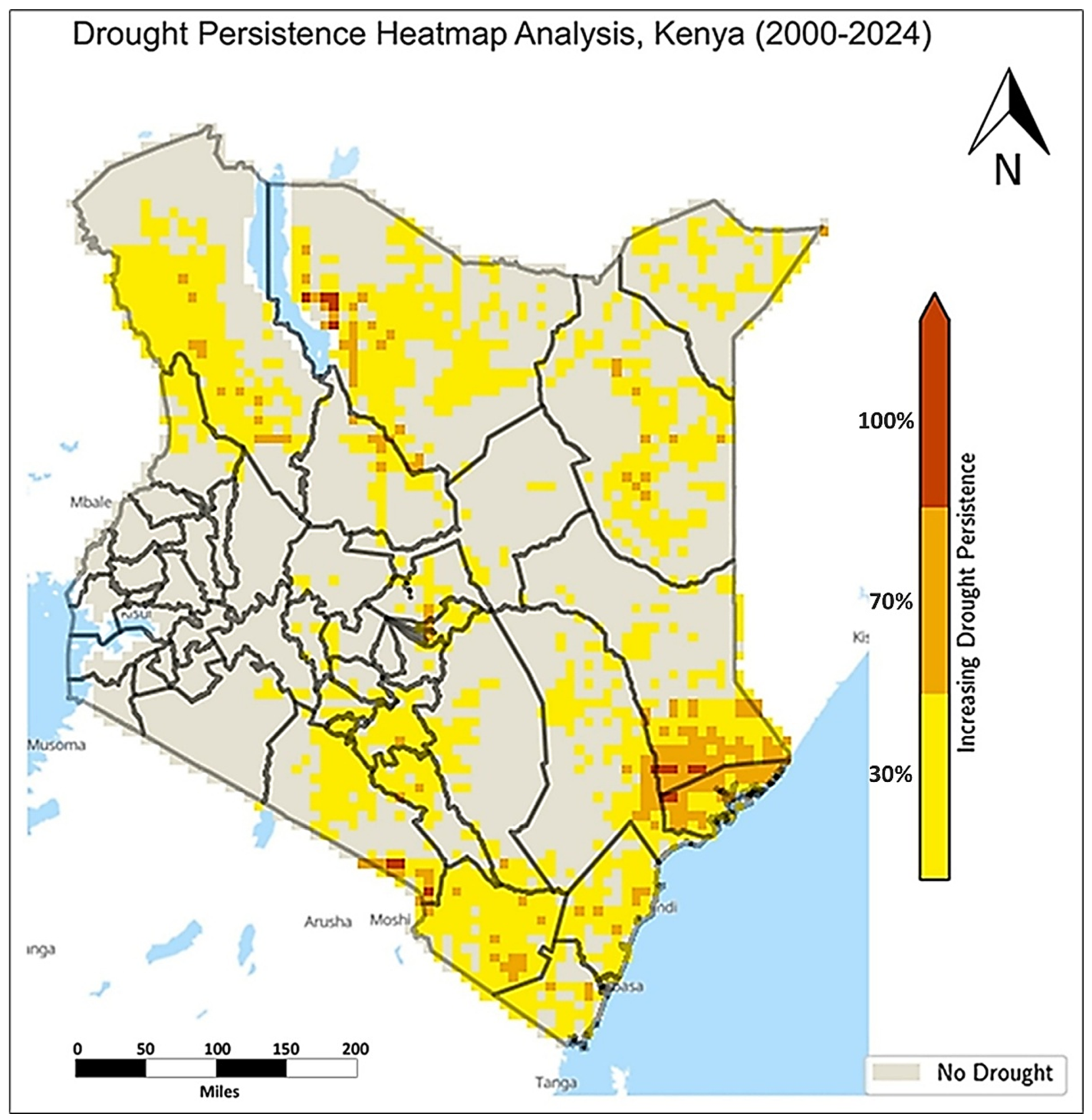 Figure 8) provides an integrated perspective on the cumulative drought experience across Kenya from 2000 to 2024. Persistent hotspots in Marsabit, Turkana, and Wajir emphasize the chronic nature of drought in the northern ASAL belt. These counties are socioeconomically reliant on pastoralism, which is acutely sensitive to rangeland degradation, water scarcity, and animal mortality during droughts [