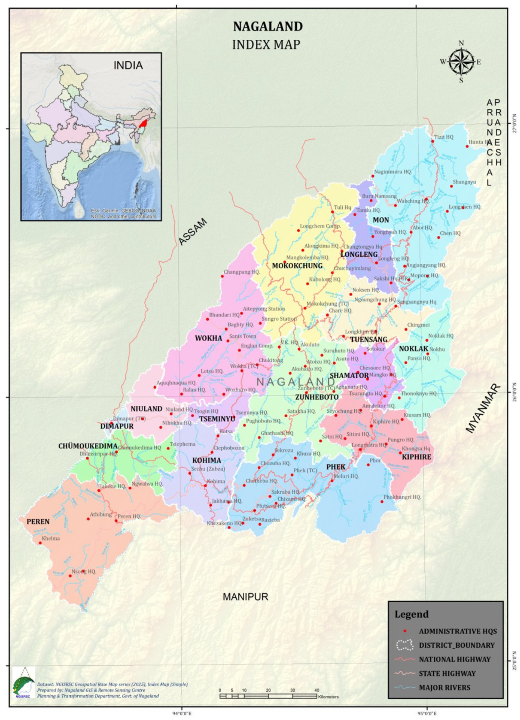 - Gateway of Nagaland-District Dimapur. 2025. Available online: https://dimapur.nic.in/about-district/#:~:text=A%20large%20area%20of%20the,44%E2%80%B2%2030%E2%80%9D%20E%20Longitude (accessed on 15 October 2025).