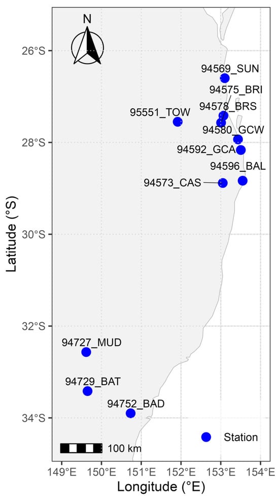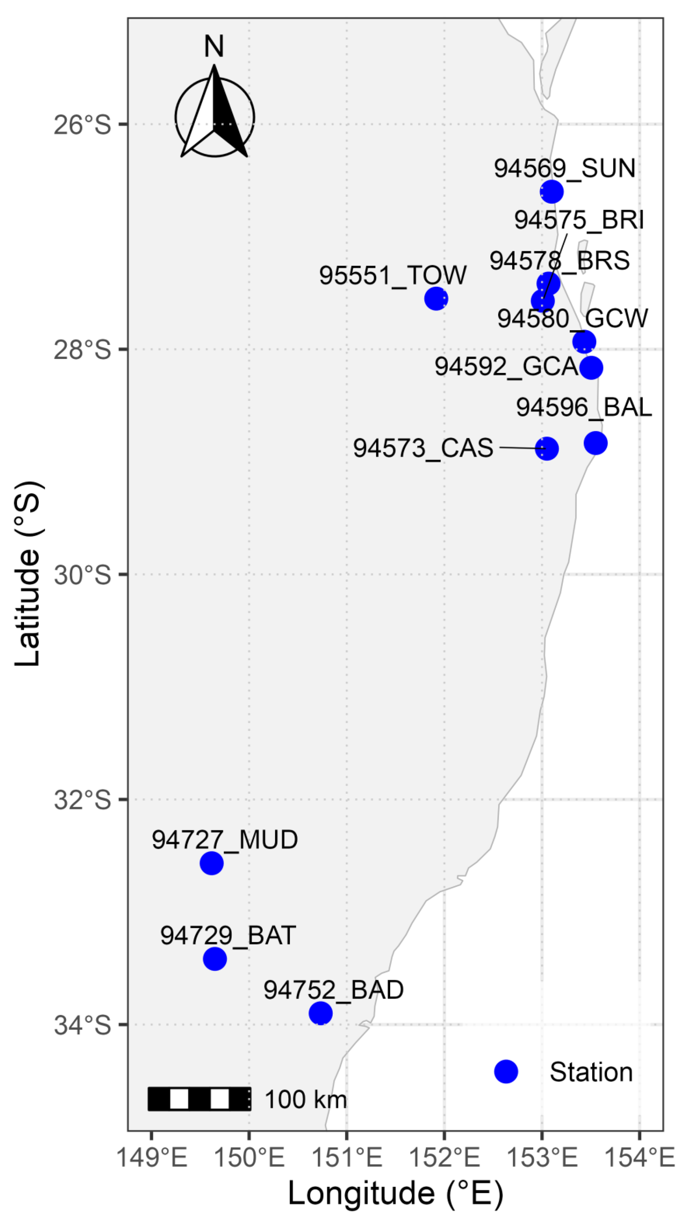The analysis focuses on eleven synoptically and topographically diverse meteorological stations across New South Wales (NSW) and Queensland (QLD), Australia (Figure 1). Station elevations range from 2 m (94596_BAL) to 745 m (94729_BAT), latitudes span 25.5° S–33.9° S, and longitudes cover 149.6° E–153.6° E. Coastal sites (94569_SUN, 94580_GCW) experience diurnal sea-breeze regimes, while highland stations (94727_MUD, 94729_BAT, 95551_TOW) undergo enhanced synoptic forcing, downslope winds, and mountain–valley circulations. Intermediate riverine and urban peripheral sites (94573_CAS, 94575_BRI, 94578_BRS, 94592_GCA, 94596_BAL, 94752_BAD) capture mixed microclimates shaped by land use and topography. These spatial clusters enable rigorous evaluation of regional pooling versus at-site modelling across subtropical to warm-temperate climate zones.