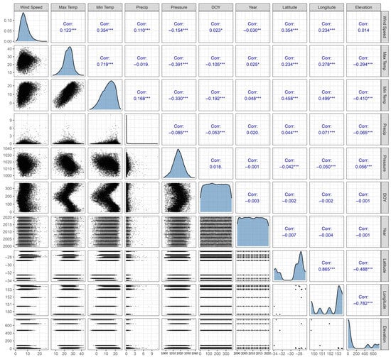 Latitude and longitude are strongly correlated (r = 0.87), indicating southeast coastal clustering and a northeast–southwest environmental gradient (Figure 1). Elevation correlates moderately with latitude (r = 0.46) due to southward terrain rise toward the Great Dividing Range, and negatively with temperature (r = −0.42 to −0.29) via orographic lapse-rate effects. The strong negative correlation between elevation and longitude (r = −0.79) indicates that inland elevated sites lie westward of coastal stations. Wind speed and precipitation exhibit right-skew with extreme tails; temperatures and pressure are near-Gaussian. These spatial variables enable regional models to learn continuous wind climatologies and differentiate microclimates. Weak to moderate inter-variable correlations indicate that multivariate models must account for nonlinearity and interactions while benefiting from low multicollinearity. Spatial wind associations validate hierarchical and regional approaches that pool strength across locations.