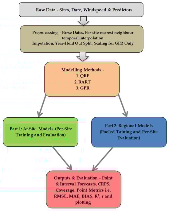 This research aims to fill this knowledge gap by conducting a comprehensive comparative analysis of BART, GPR, and QRF for probabilistic wind speed forecasting across eleven stations in NSW and QLD, Australia [37]. The study leverages 21 years (2000–2020) of daily observations, including maximum and minimum temperature, precipitation, and surface pressure, which are key meteorological drivers, to train and validate models in both at-site and regional pooling regimes. Forecasts are assessed using multiple point and probabilistic metrics: RMSE, mean absolute error (MAE), coefficient of determination (R2), bias, Pearson correlation, interval coverage, and CRPS. This multidimensional evaluation framework enables robust assessment across accuracy, calibration, and sharpness dimensions. By systematically examining performance trade-offs, spatial information transfer, and uncertainty calibration, this work advances knowledge on machine learning-based wind forecasting and informs climate-resilient energy planning.
