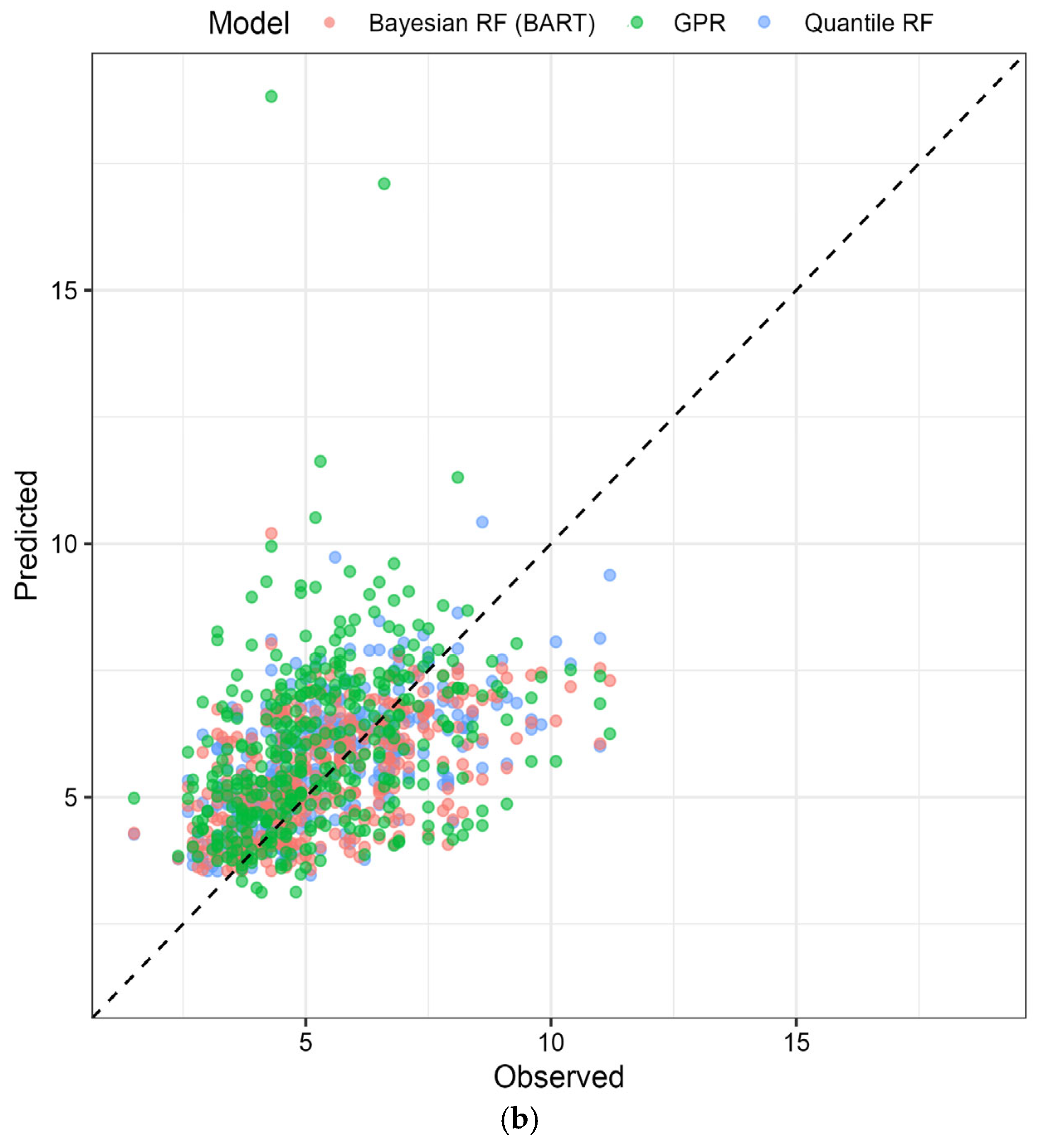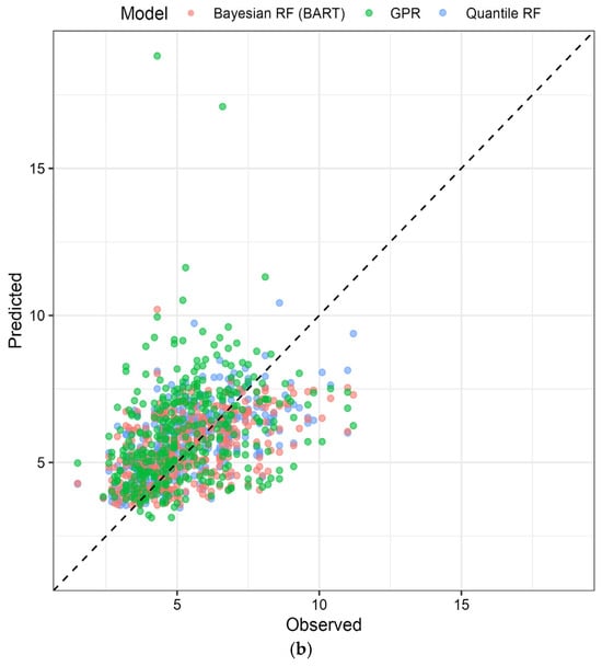 Key mechanistic insights from variable importance are as follows (Figure 6 and Figure 7): pressure and minimum temperature drive 60–80% of forecast skill across all methods, validating physical plausibility. Spatial predictors (latitude and longitude) become critical in regional models, enabling differentiation among microclimates. Precipitation in particular contributed minimally, supporting its possible exclusion for computational efficiency. These consistent rankings across permutation-based (QRF, GPR) and split frequency (BART) metrics validate robustness. Diagnostic visualisation integration (Figure 4, Figure 5 and Figure 8): Observed-versus-predicted scatter (Figure 4) and time series trajectories (Figure 5 and Figure 8) confirm the RMSE–coverage trade-off and GPR’s wider scatter accompanies appropriately broad intervals, while QRF/BART’s tighter predictions mask dangerous under-coverage. The multi-algorithm comparison in Figure 8 directly visualises how regional pooling preserves QRF accuracy, degrades BART calibration, and yet maintains GPR reliability, validating the quantitative findings with transparent visual evidence.