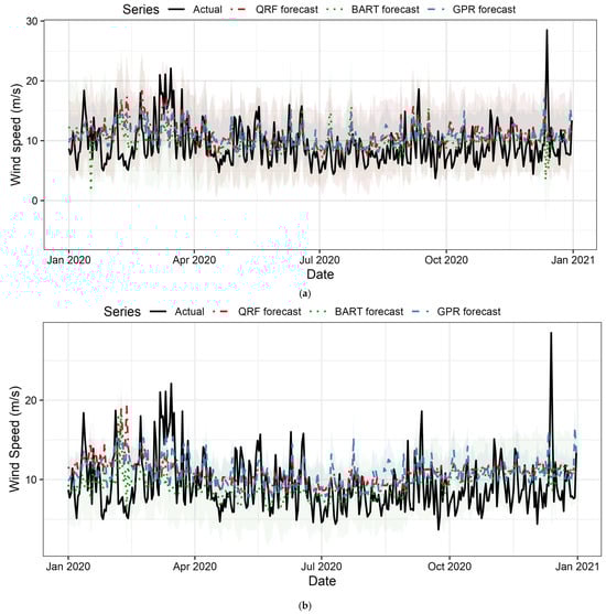 At-site (a) and regional (b) wind speed forecasts for site 94575_BRI with actual and predicted series (QRF, BART, and GPR). Shaded intervals show uncertainty; regional pooling gives broader, less calibrated coverage.