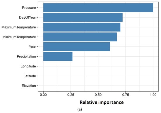 Overall, these variable importance patterns are consistent across all eleven stations and across QRF, BART, and GPR. Surface pressure and minimum temperature together account for approximately 60–80% of total importance, day of year contributes a robust seasonal signal (20–25%), and spatial covariates (latitude, longitude, elevation) are negligible in at-site models but rise to moderate or high importance (≈45–60% of maximum) in regional frameworks. In this sense, Figure 6 and Figure 7 provide a compact visual summary of variable importance across models and sites, highlighting a stable hierarchy of predictors that underpins the main conclusions of this study. Taken together, the variable importance profiles in Figure 6 and Figure 7 act as a summary map of predictor influence across all methods and sites: pressure and minimum temperature dominate, day of year provides a secondary seasonal signal, and spatial covariates become essential only in regional frameworks, where they encode microclimate differentiation.
