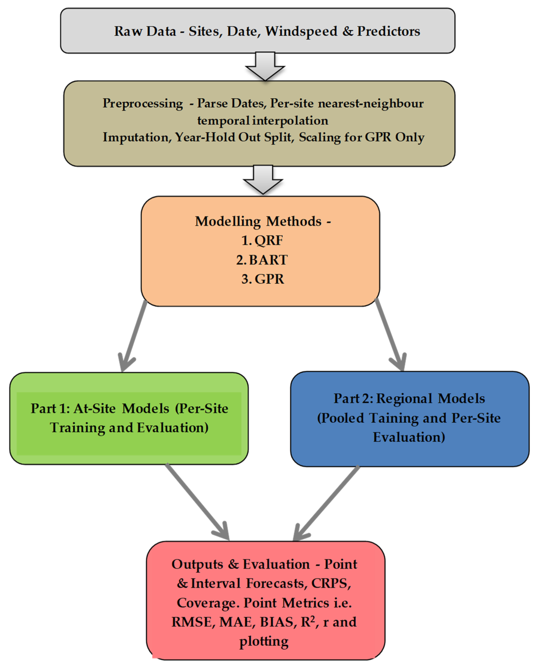 The specific objectives are as follows: (1) to compare the point accuracy and probabilistic skill of BART, GPR, and QRF under at-site and regional modelling frameworks; (2) to quantify the impact of regional pooling on RMSE, MAE, R2, bias, Pearson correlation, CRPS, and interval coverage for each method; (3) to identify key meteorological and spatial predictors through variable importance analyses; (4) to provide actionable recommendations for operational deployment in heterogeneous climatic regions; and (5) to establish benchmarks for future probabilistic wind forecasting research in Australia and beyond. These objectives are highly relevant to renewable energy sectors worldwide.