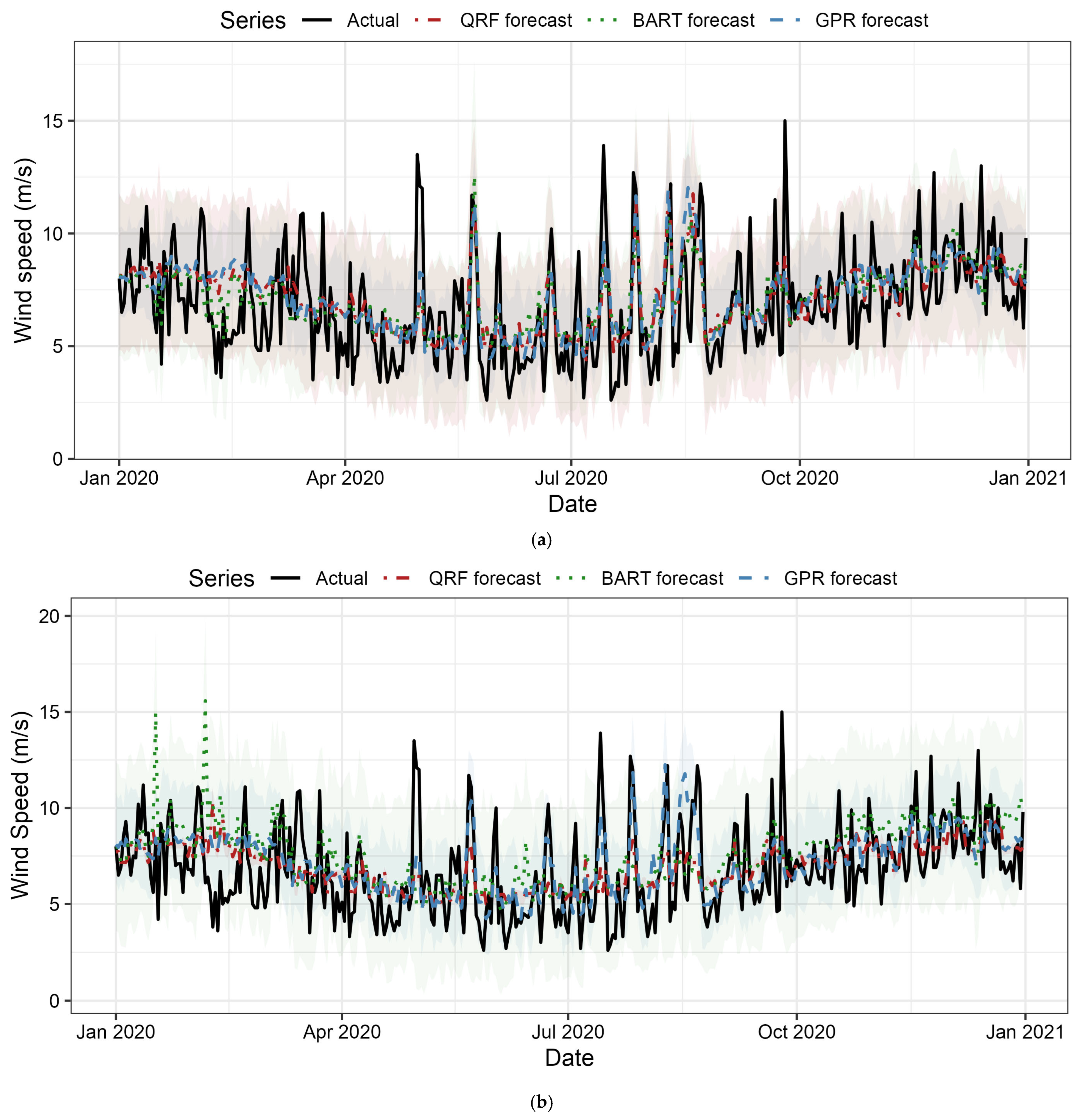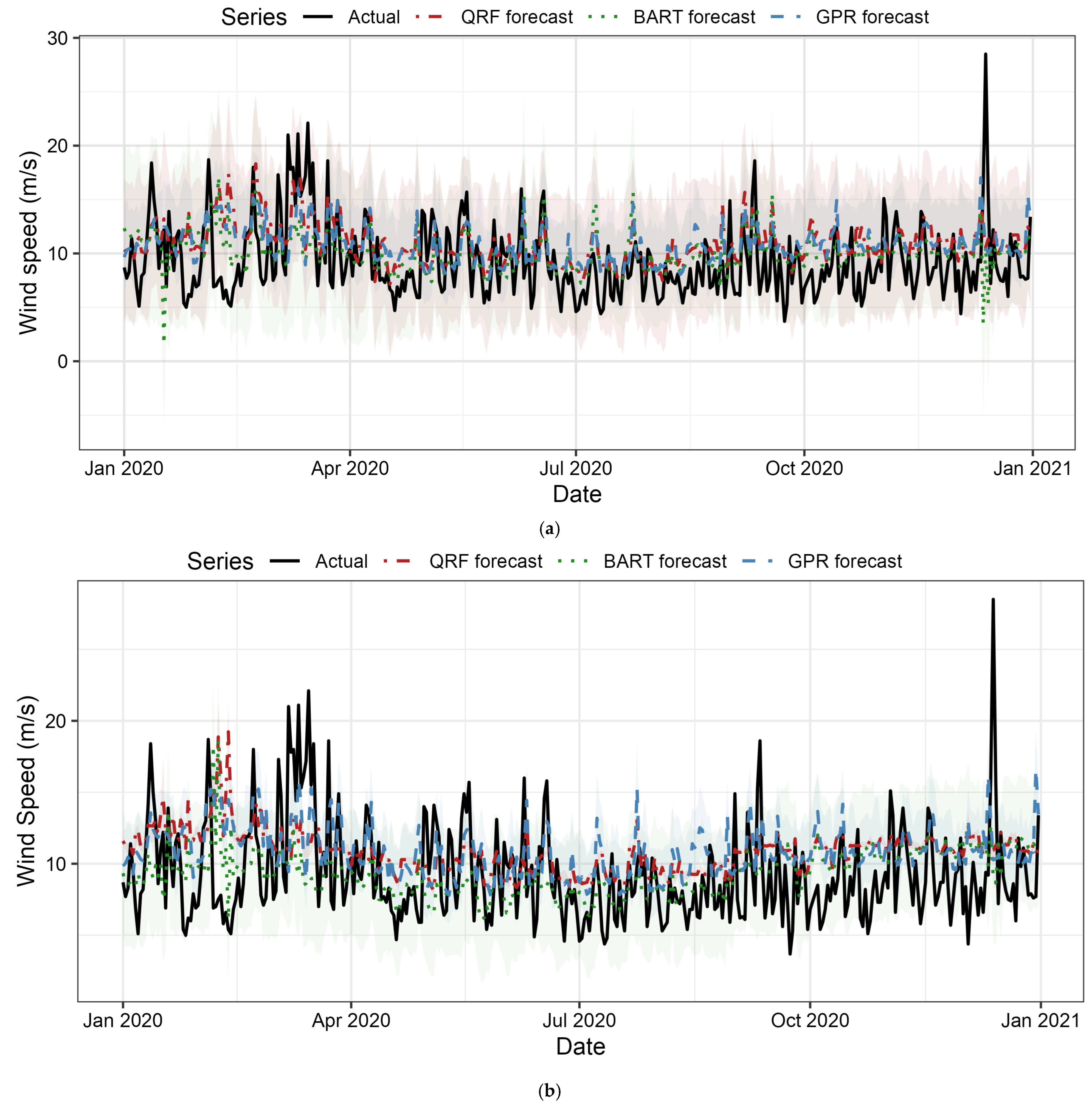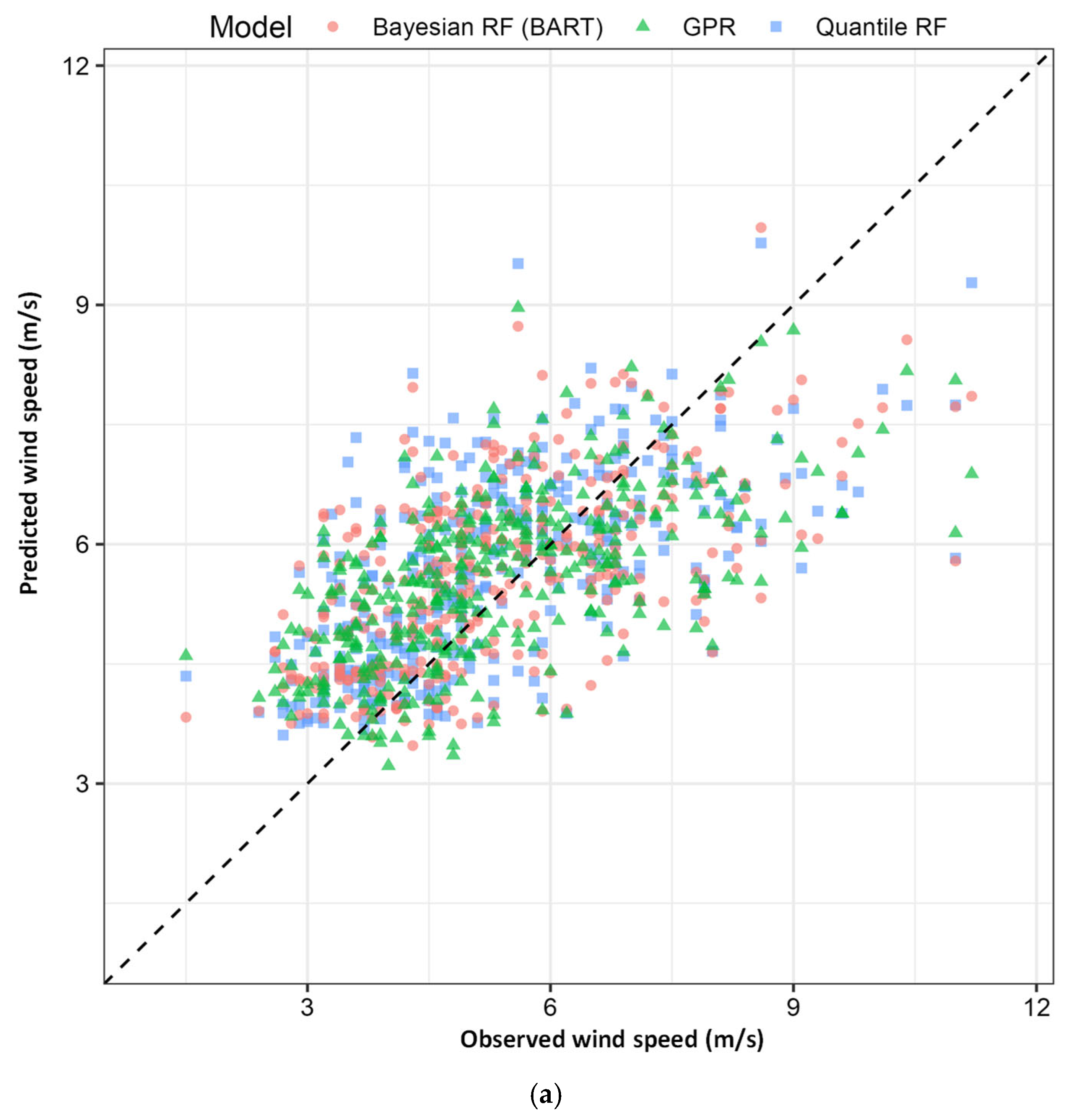 Wind speed prediction approaches can be broadly grouped into four categories: (i) physical models, primarily numerical weather prediction (NWP) systems that solve the governing atmospheric equations; (ii) statistical models, including regression and classical time series formulations; (iii) artificial intelligence (AI) models, such as ensemble trees, Gaussian processes, and neural networks; and (iv) hybrid models that combine NWP outputs with statistical or AI post-processing. Physical NWP models offer dynamically consistent forecasts over large domains but can exhibit systematic local biases and high computational cost. Statistical and AI methods, including the BART, GPR, and QRF algorithms considered here, exploit historical data to learn the empirical relationships between predictors and wind speed, enabling flexible, high-resolution, and probabilistic forecasts [15,16,17,18]. Hybrid NWP–ML systems have recently gained prominence by using NWP to capture large-scale circulation while machine learning downscales and recalibrates forecasts for specific sites or regions [19,20,21].