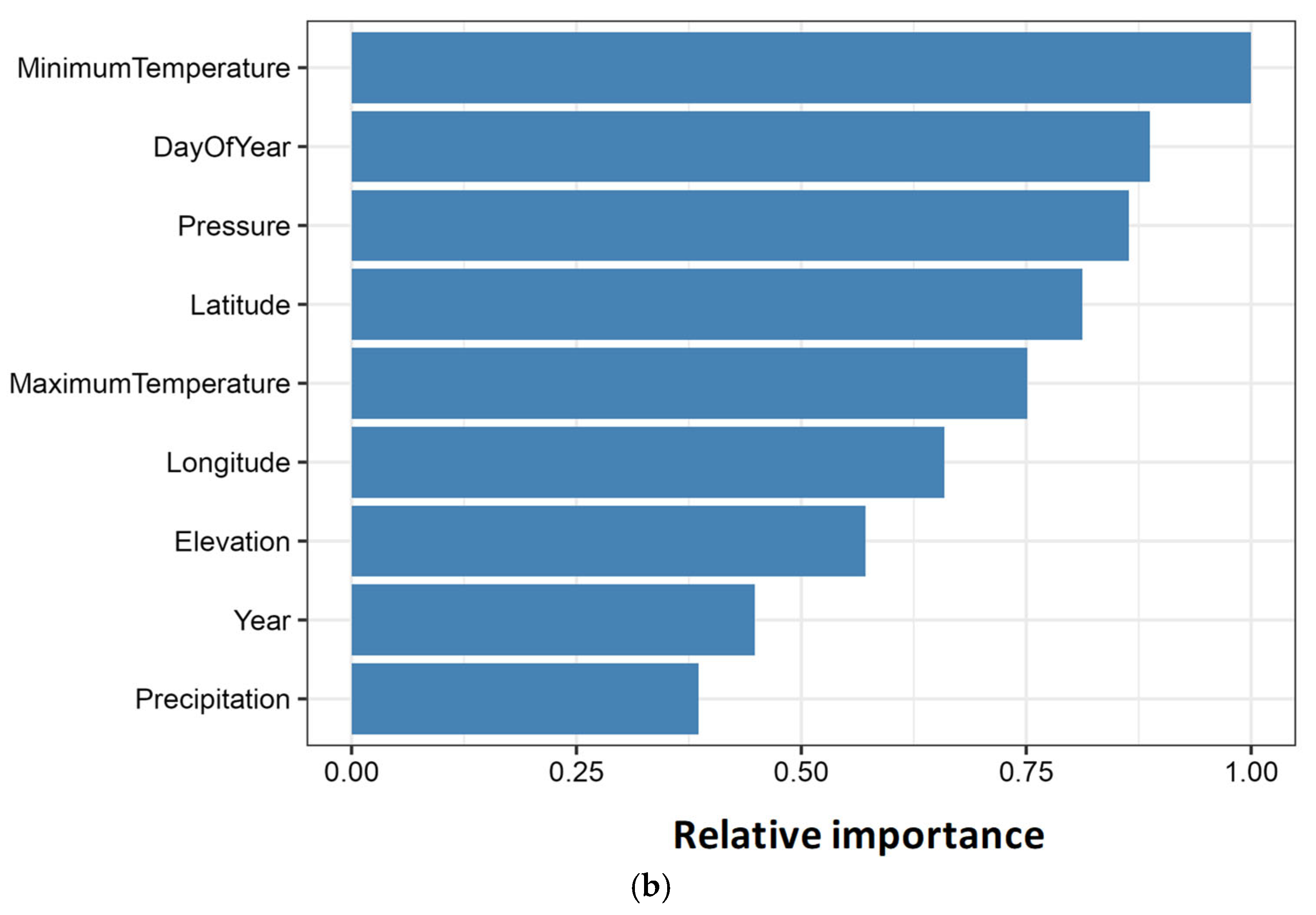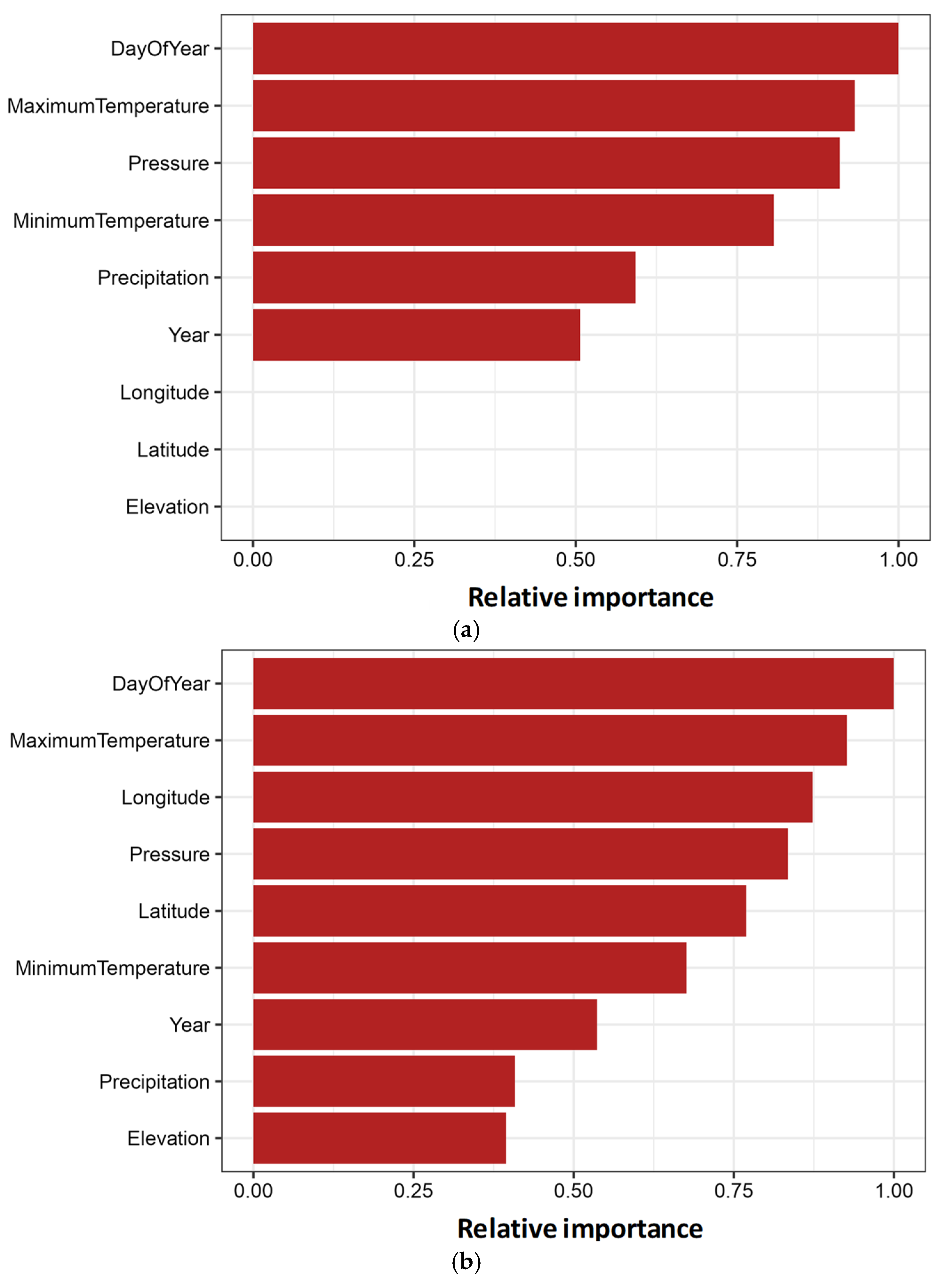 This enables the algorithms to learn seasonal cycles in wind climatology driven by the annual migration of the subtropical ridge, mid-latitude storm tracks, and monsoonal influences. In regional models (Figure 6b and Figure 7b), spatial predictors—latitude, longitude—gain substantial importance (45–60% of maximum), as they provide the sole mechanism for algorithms to differentiate among geographically dispersed stations with contrasting microclimates when training on pooled data. Latitude encodes meridional gradients, longitude captures continental versus maritime exposure along the east coast, and elevation signals orographic wind enhancement and down slope wind potential.