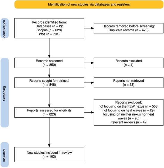 An exclusion process was applied in the screening. Four records were first removed due to mismatched document types (book chapters), followed by the exclusion of 23 records for which full texts were unavailable. The remaining 823 articles were assessed for eligibility. This step involved a manual review in which our research team meticulously screened titles and abstracts, followed by full-text reviews, to determine relevance to heat wave impacts on the FEW nexus. We applied the following exclusion criteria: (1) not focusing on the FEW nexus; (2) not focusing on heat waves; (3) focusing on neither nexus nor heat waves; and (4) irrelevant reviews. Articles were included if they met all inclusion criteria: (1) they examined at least one component of the FEW nexus (food, energy, or water) under extreme heat conditions; and, (2) they provided empirical evidence, modeling analysis, or conceptual discussion relevant to heatwave-induced impacts. Following Schroeder’s guidance [33], these articles were coded based on the inclusion and exclusion criteria. A code of 1 indicated full compliance with the criteria, while a score of 0 indicated non-compliance. This process finally yielded a selection of 103 publications. The screening was conducted by five reviewers. Each record was independently assessed by two reviewers. Discrepancies were resolved through discussion within the research team until consensus was reached.
