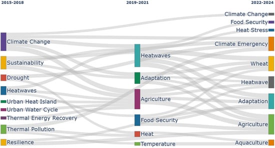 The period of 2015–2018 was primarily focused on broad and systems level issues like Climate Change, Sustainability, Urban Heat Islands, Thermal Pollution, and Resilience. This stage reflects a time when researchers focused on overall environmental conditions and the underlying causes of heat-related risks, rather than on their concrete impacts. The thematic arrangement in 2019–2021 is more narrowed on practical extremes of climate and human–environment relationships. The links between previous and subsequent themes (e.g., climate change—heat waves; sustainability—adaptation; drought—agriculture) reveal how the original conceptual concepts contributed to the applied research on the assessment of vulnerability and sector-specific adaptation demands. By 2022–2024, the literature had matured and spread into more specialized and differentiated themes against Climate Emergency, Heat Stress, and Wheat, although Adaptation and Agriculture persisted, signaling that they will be relevant as the field becomes risk management and resilience planning. The emergence of Aquaculture is also an indicator of diversification of elements of the FEW nexus that are not heavily exploited due to the increase in temperature. In general, the transformation of broad climatic concerns to sustainability-oriented investigation, and then to event-specific heat wave studies and finally to sector-specific specializations, can be viewed as the response of the literature to the increasing number of climate events, policy urgency, and the necessity of special adaptation measures.