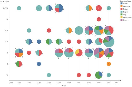 The trend of studies on heat wave impacts on food, energy, and water systems (n = 103) over the past 10 years. Note: The numbers beside each circle represent the number of articles for each FEW type and research scale.