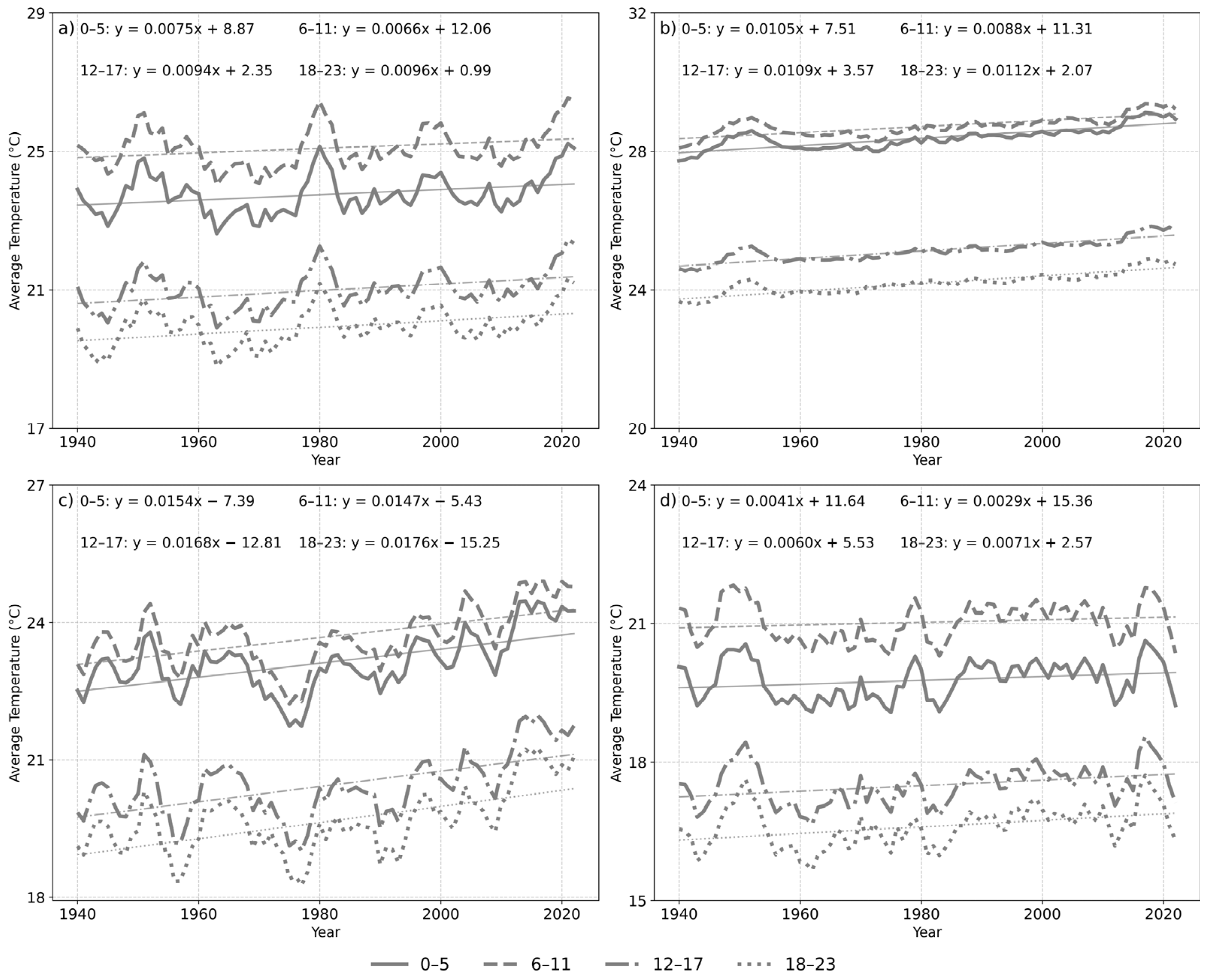 APA StyleXing, Y., Shi, C., Jiao, Y., Shang, M., Du, J., & Bai, L. (2026). Long-Term Hourly Temperature Dynamics on Tropical Hainan Island (1940–2022). Climate, 14(1), 9. https://doi.org/10.3390/cli14010009