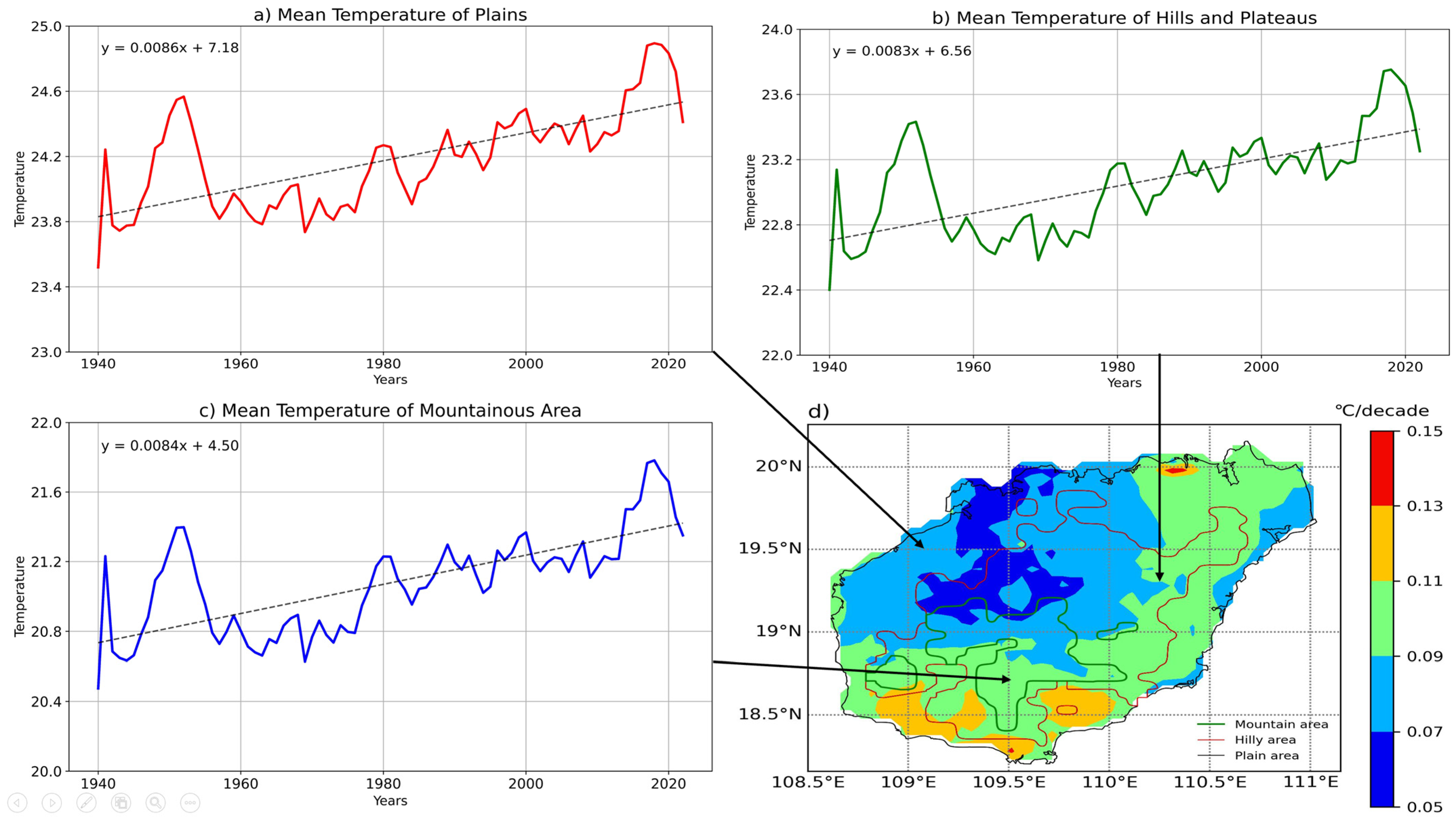 - Temperature variations exhibit significant spatial heterogeneity, with coastal plains (0.11 °C/decade) warming faster than mountainous inland regions (0.08 °C/decade). This disparity is primarily influenced by a combination of factors, with the lower warming rate in mountainous areas largely attributed to topographic regulation and high vegetation cover.