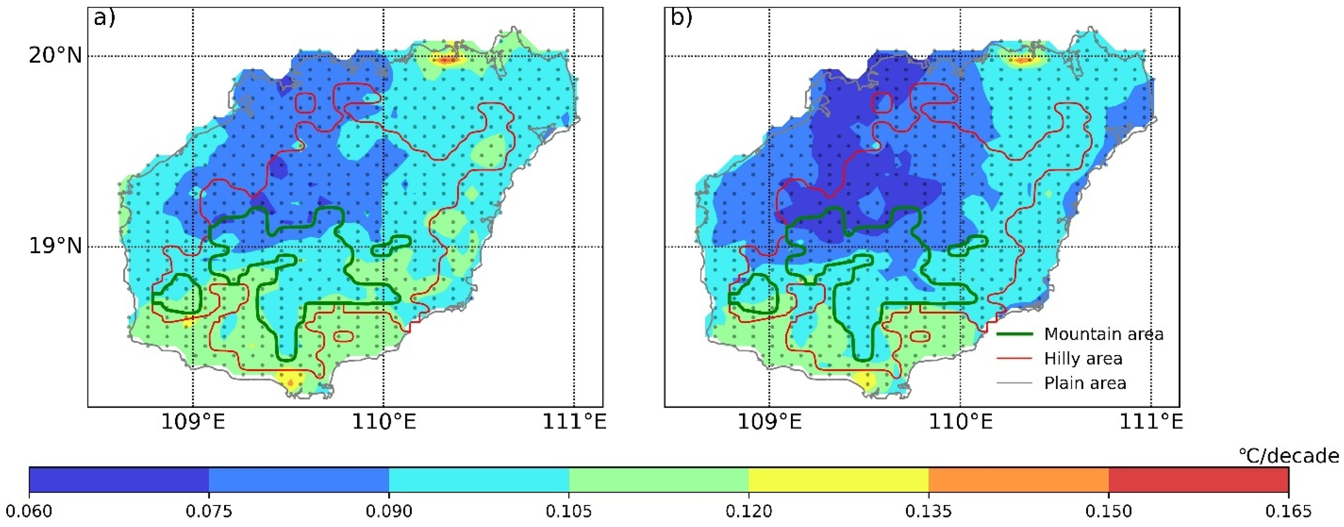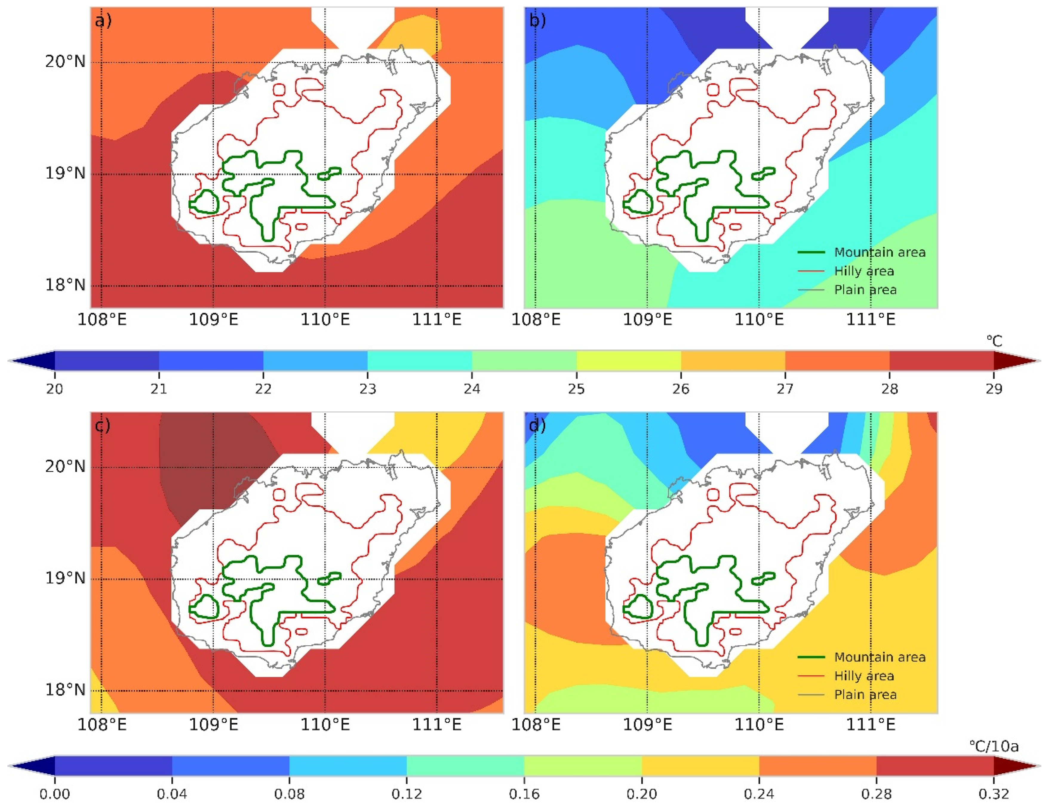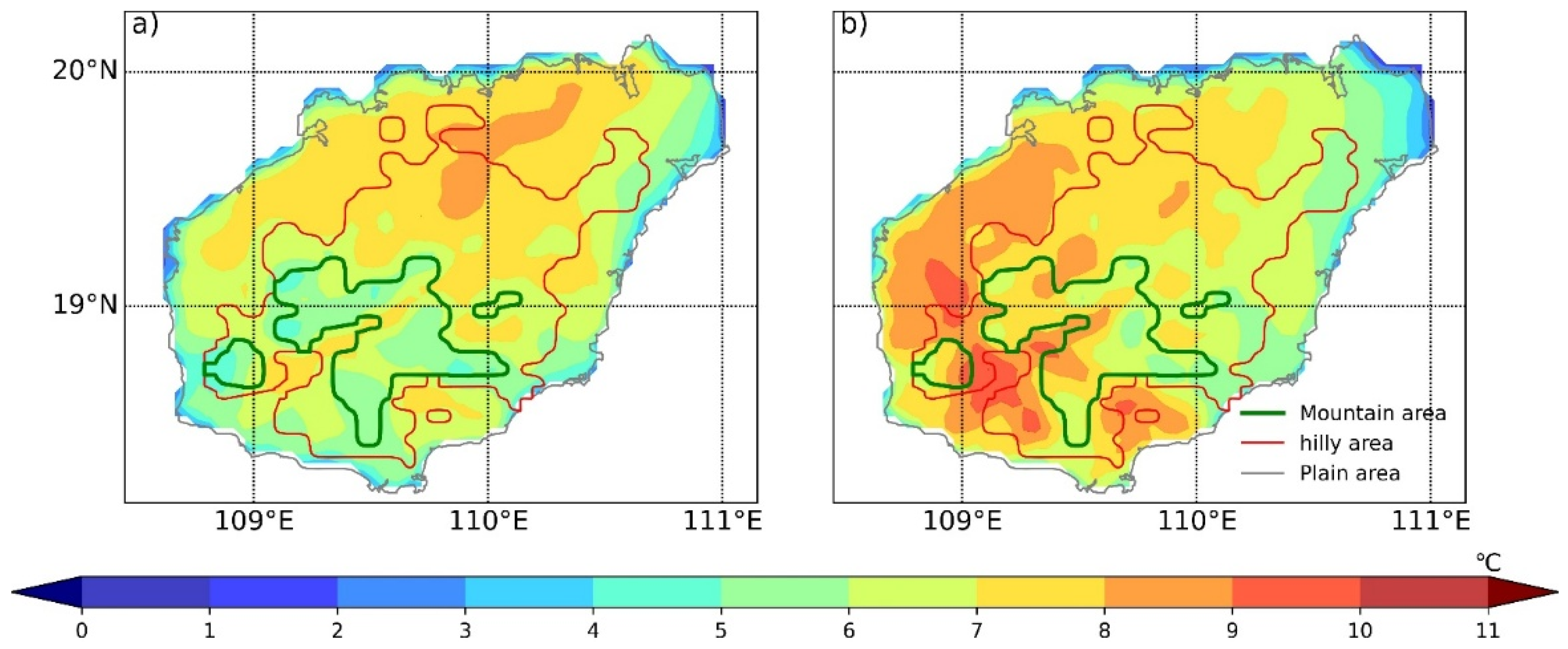 - Diurnal temperature range (DTR) variations show distinct topographic dependence. During the warm season, the northern region exhibits the maximum DTR (8–9 °C), while coastal areas display the minimum values (1–2 °C). In the cold season, a significant southwest–northeast gradient is observed, with the maximum values occurring between Jianfengling and the central mountainous regions (approximately 9 °C). This phenomenon is closely related to the interaction between oceanic regulation, the northeast monsoon, and topographic lifting effects.