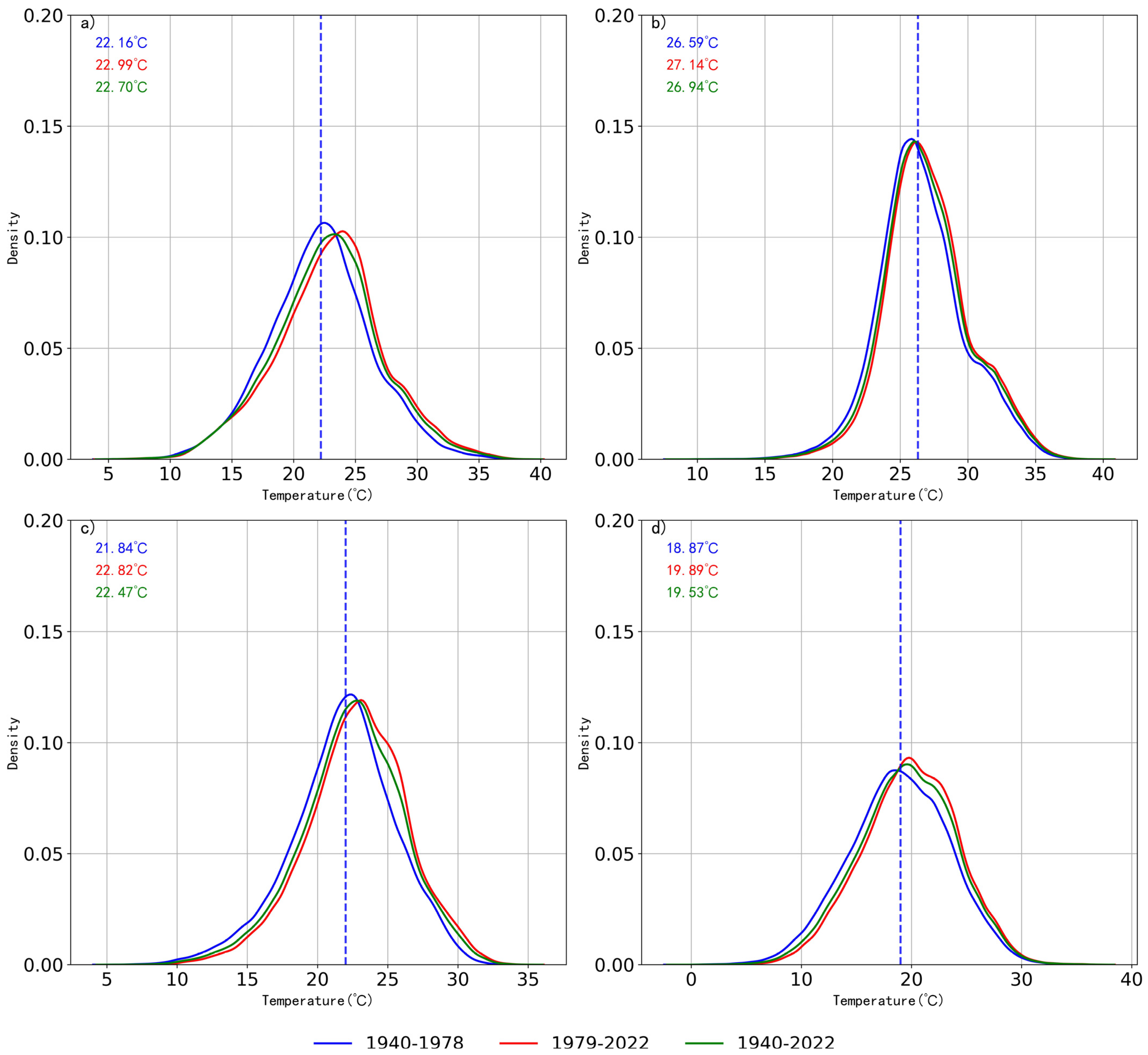- Probability density function (PDF) analysis reveals that the PDFs for transitional and cold seasons are wider, with greater fluctuations, and show a distinct rightward skew, most notably in the 1979–2022 period. This indicates that, while the average temperature on Hainan Island is rising, the frequency of extreme temperature events is also expected to increase.