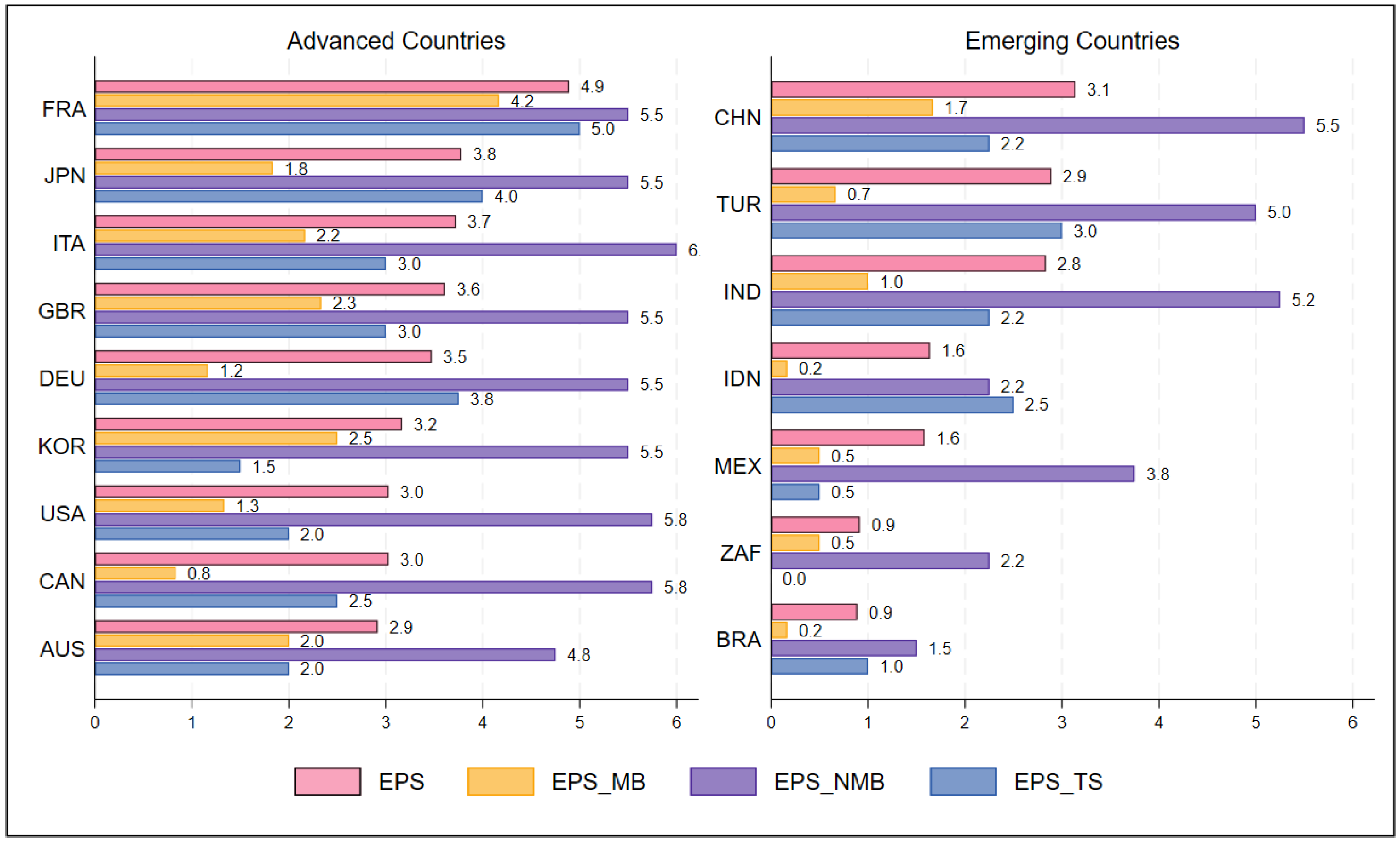 4.3. Estimation Results Between Advanced and Emerging Countries
