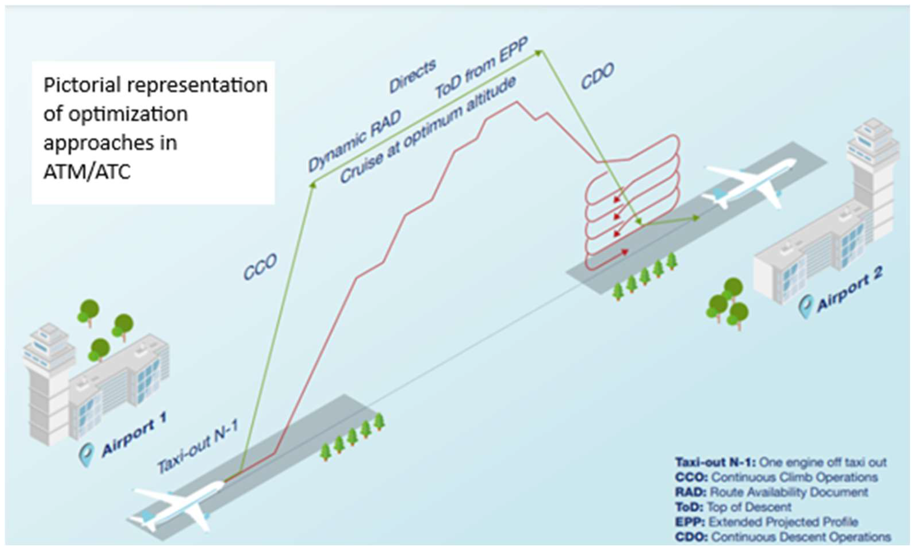 | CCO | Tactical Pre-tactical | Altitude Speed | RF eqCO2 | Departure optimization |