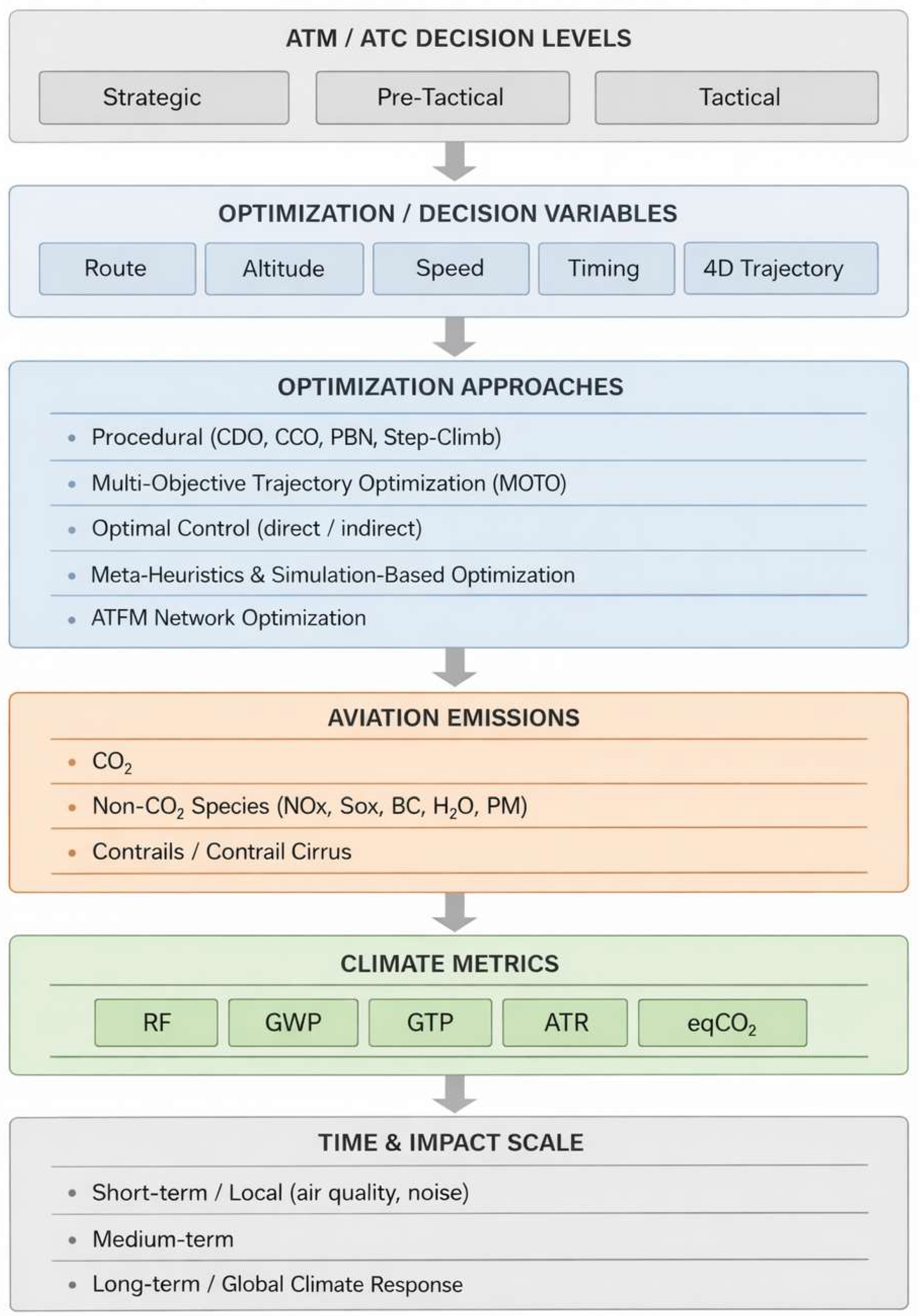 | Tactical and real-time ATM/ATC operations (trajectory management, contrail mitigation) | Hours/days | Short-term or instantaneous metrics (e.g., RF, aCCF-based indicators) | These metrics explicitly capture the strong spatial and temporal variability of short-lived non-CO2 effects, particularly contrail-related forcing, and can be directly coupled with meteorological forecasts and real-time trajectory optimization. Their sensitivity to atmospheric conditions makes them unsuitable for long-term policy but essential for operational decision making. |