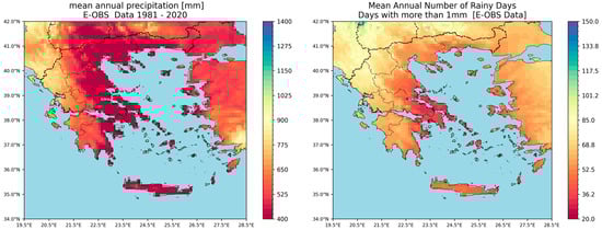 In the Mediterranean, the quality of E-OBS in the Mediterranean is directly impacted by the density of the corresponding rain gauges, which is generally sparser, compared to central and northern Europe. This sparsity can lead to a smoothing effect, particularly for precipitation, causing an underestimation of extreme values and reduced accuracy in representing the sharp climatic gradients found in mountainous areas. The version used is 30.0e (it should be noted that according to the E-OBS dataset documentation, 48 HNMS, mostly airport stations that are unevenly distributed, are used over Greece, but not all of them cover the whole study period; sixteen cover the whole period, eighteen reported until 2004, two until 2011, eleven were installed during the 90s, and one the period 2004–2020). Figure 3 presents results corresponding to Figure 2, mean annual precipitation, and NRD for the 1981–2020 period, calculated from the E-OBS data. While the overall spatial pattern for the mean rainfall is generally comparable, E-OBS yields notably lower precipitation totals, with maxima hardly reaching 1000 mm/year. Analogous is the pattern for the mean NRD where the values vary from almost 30 to hardly 100 days per year.