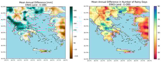 In overall, E-OBS and ERA5-Land precipitation estimations presented significant differences in some cases that could attributed to the nature of sources of each dataset. Although ERA5-Land is a well-established product used in several research studies, having the ability to detect the geographical patterns well, caution, due to precipitation overestimation, is necessary in areas of complex topography. On the other hand, the E-OBS dataset needs to be enhanced with more in situ rainy stations so as to better “capture” precipitation patterns, especially in areas of complex topography.