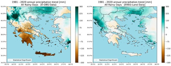 - Differences in precipitation of low intensity between the two datasets are still evident. Overall, E-OBS presented a clear decline in Crete, while ERA5-Land presented an increase in almost the whole country. Regarding the corresponding number of rainy days, the distinction between the two datasets is still prominent. ERA5-Land data presented a slight increase in NRD, while E-OBS revealed an overall reduction, with only a few exceptions.