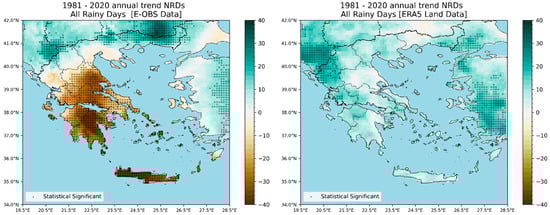 Similarly, the comparison of the two datasets shows even more discrepancies regarding the trend in NRD. Specifically, the analysis of the E-OBS data shows a pronounced reduction in the days with recorded rainfall, particularly evident in Central and Southern Greece. Conversely, the ERA5-Land dataset presents a slight increase in the number of rainy days across nearly the whole country.