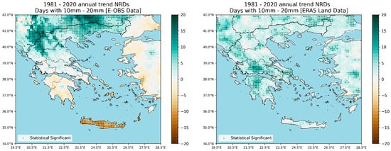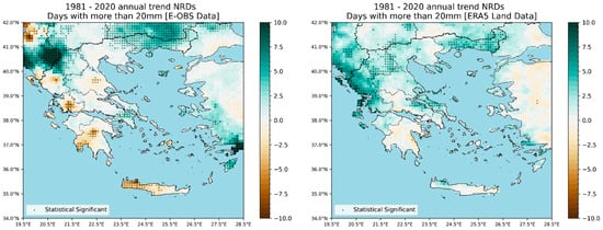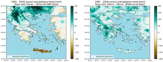 With respect to the number of rainy days (defined here as days with precipitation between 10 mm and 20 mm), the contrast in Figure 10 is less pronounced. E-OBS reveals a “gain” of more than 10 days over parts of Northern Greece, no trend or negative for southern Greece, and clearly negative over Crete. On the other hand, the ERA5-Land data suggest again a slight increase covering almost the entire country, with values hardly reaching 10 days.