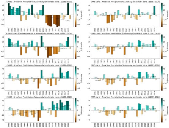Precipitation anomaly (%), for each of the ERA5-Land and E-OBS datasets, estimated as the percentage of the difference between the precipitation for a specific time period (year) and the long-term average (1980–2020) precipitation, was calculated. Positive anomalies indicate wetter-than-average years, while negative anomalies show drier-than-average years that could be associated with possible drought periods.