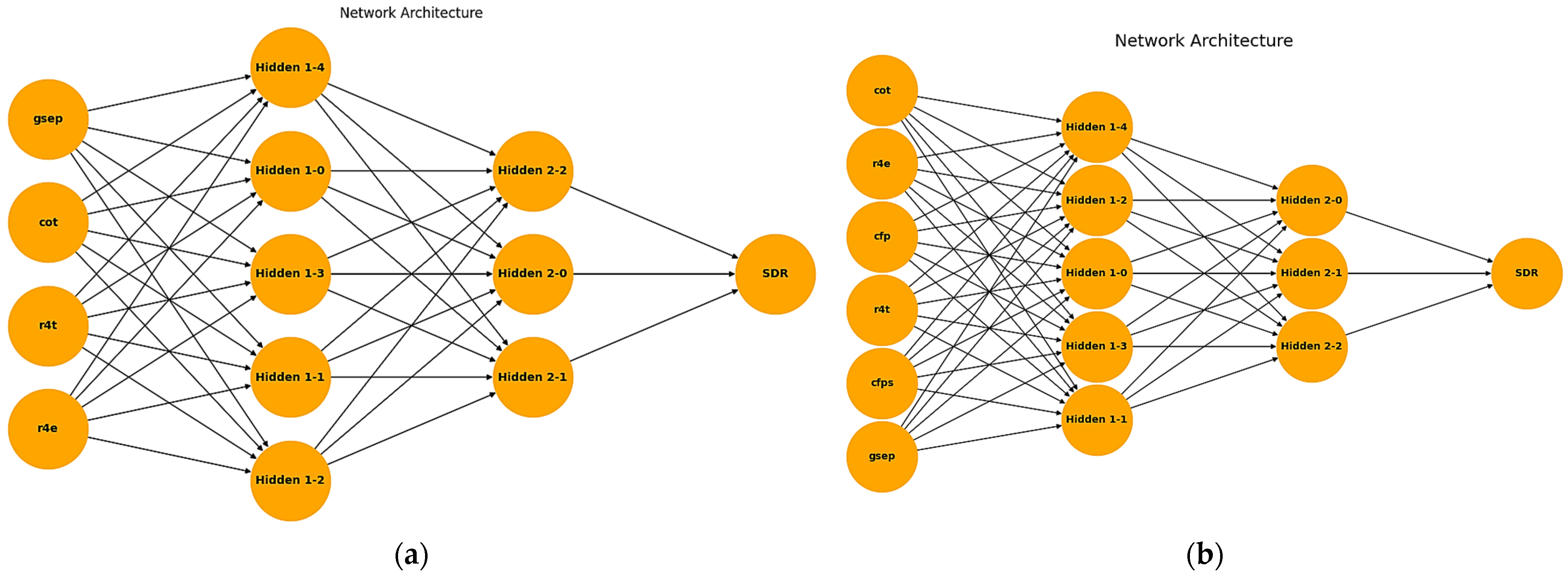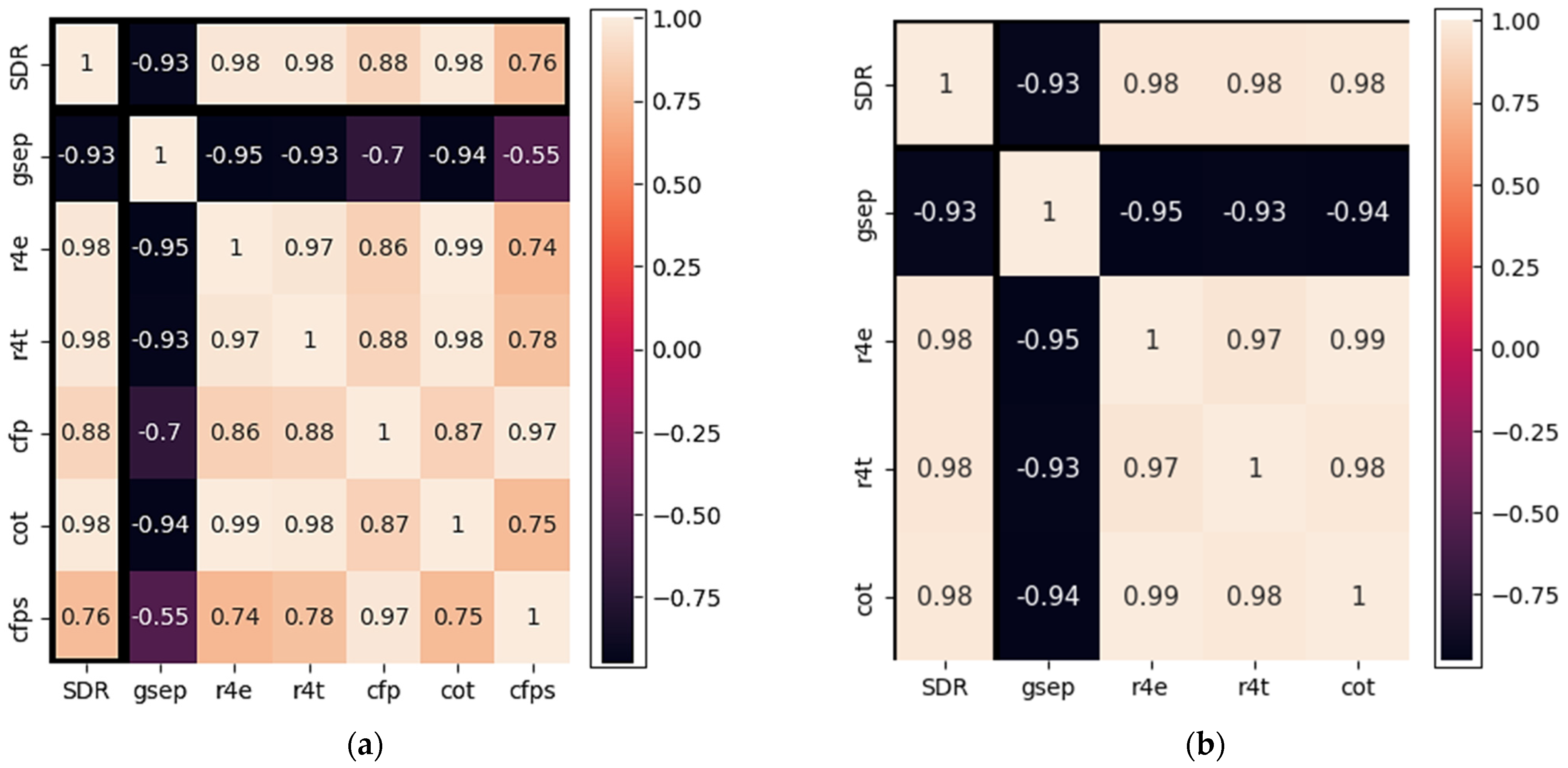 Table 4 summarizes the relationships between the SDR and all other variables based on the correlation matrix. Correlations with the SDR range from 0.76 to 0.98, with only one negative correlation (gsep). Notably, correlations exceeding 0.90, and even 0.92, regardless of sign, are associated with four independent variables: r4t, r4e, cot, and gsep. Consequently, the subsequent analysis focused on two datasets: one comprising all variables and another including only the four variables with correlations above 0.92.