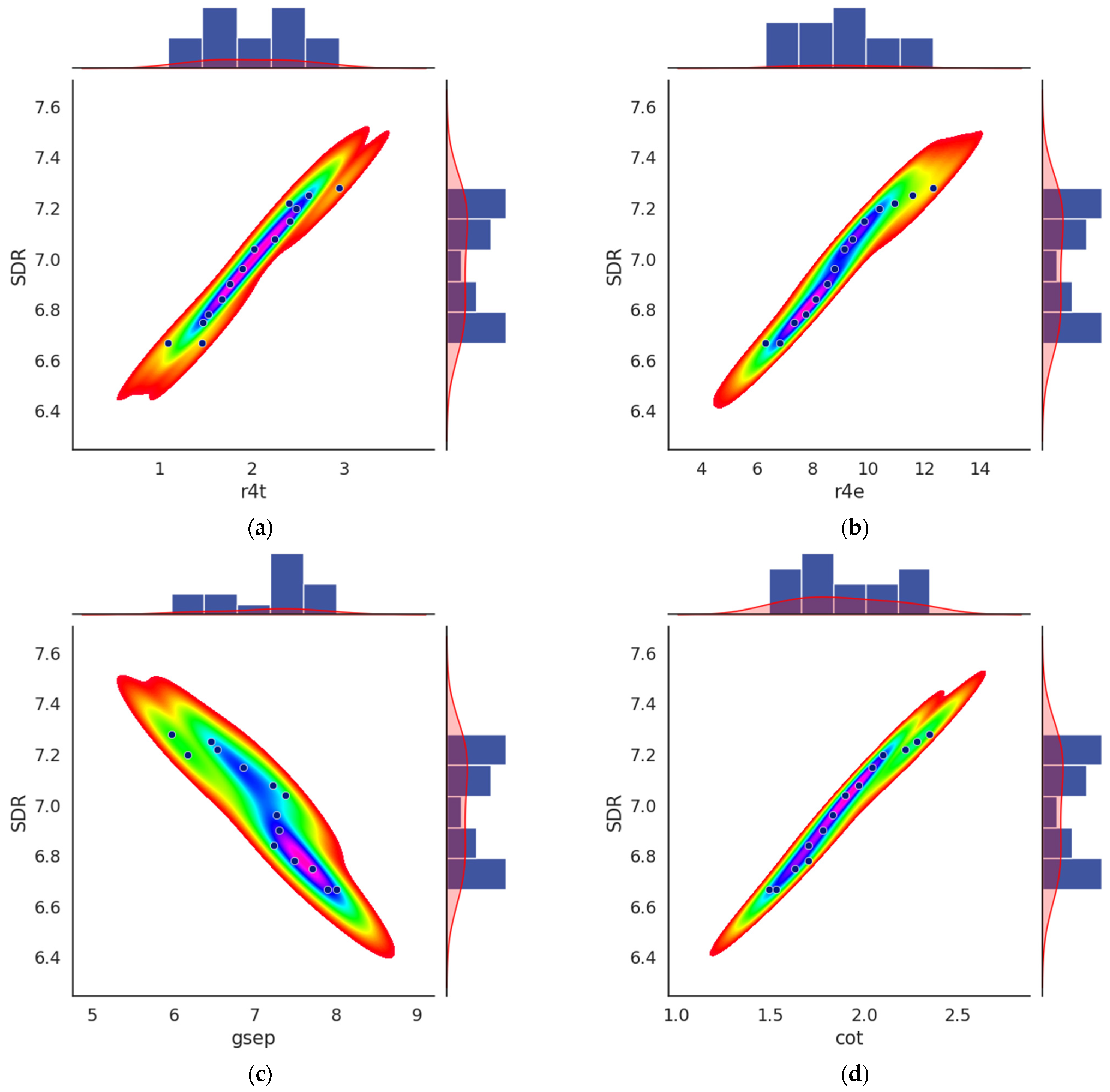 Figure 4a illustrates the distribution of r4t, which is concentrated within a narrow range, as indicated by the marginal histograms. The SDR exhibits a broader distribution with significant accumulation in the high-density area. The relationship between r4t and SDR appears close to linear, with a clear local correlation in the high-density zone, suggesting r4t may serve as a relevant predictor for the SDR.