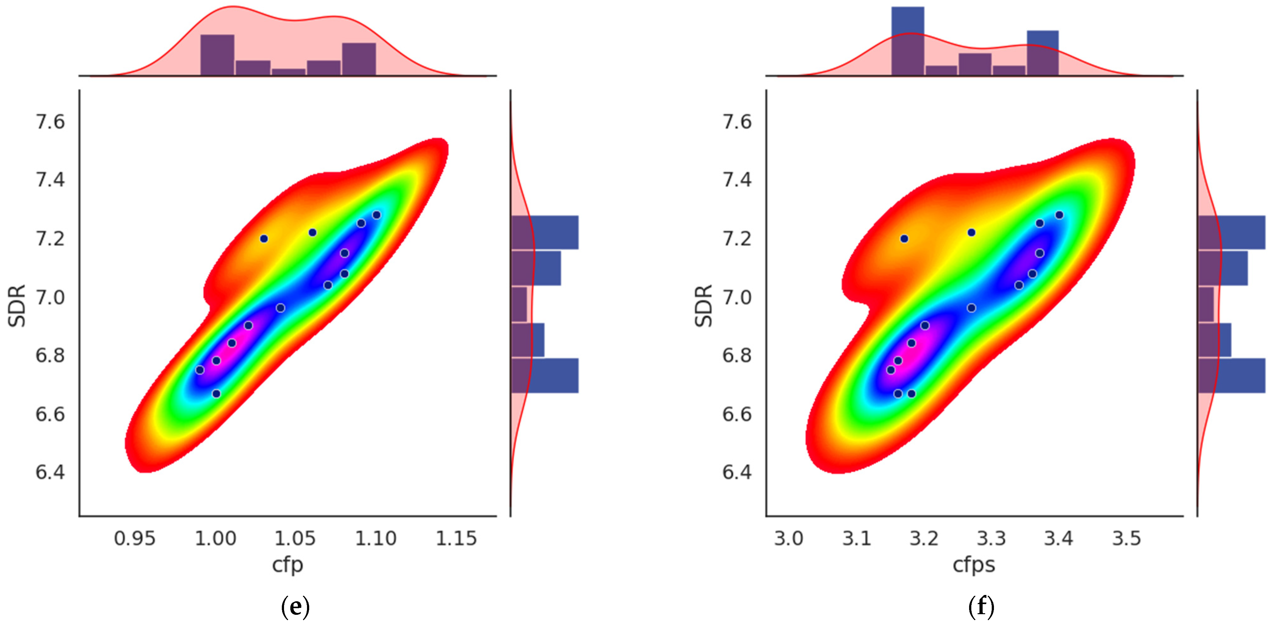 Figure 4e illustrates the correlation between cfp and SDR, with maximum density concentrated in a narrow interval, suggesting a local relationship. cfp correlates with the SDR in the high-density area, indicating a potential direct correlation.