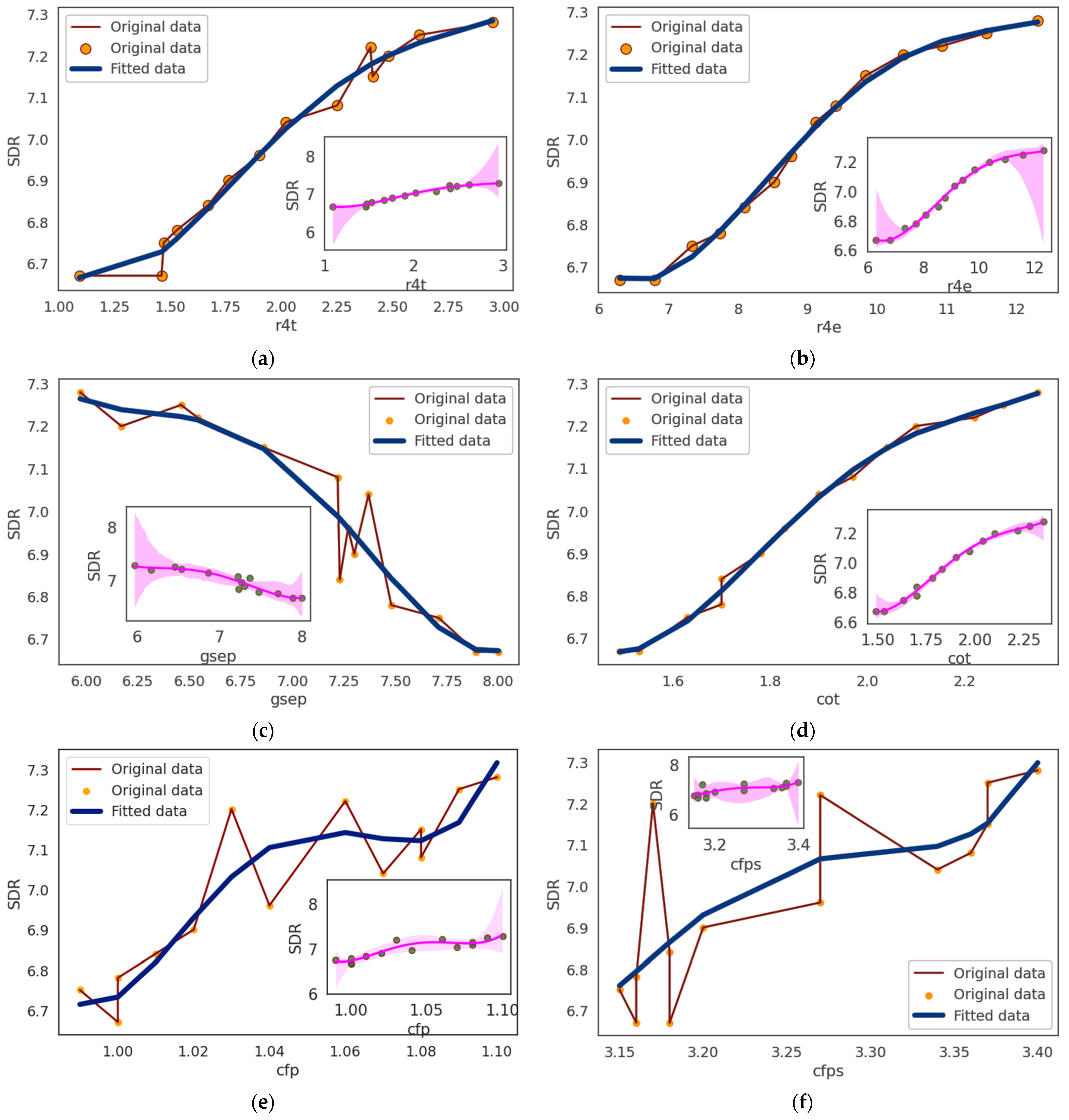 Figure 5 illustrates the relationship between SDR and each variable using both original and fitted data. The yellow scatter points represent the observed SDR values, while the blue line shows the fitted nonlinear function that captures the overall trend. The small inset provides a complementary linear regression view, where green points represent the local data used in the regression, the pink line represents the linear fit, and the shaded pink area corresponds to the 95% confidence interval. This inset highlights the local variability of the data and the degree of uncertainty around the linear approximation, confirming the general upward trend and consistency of the fitted model.