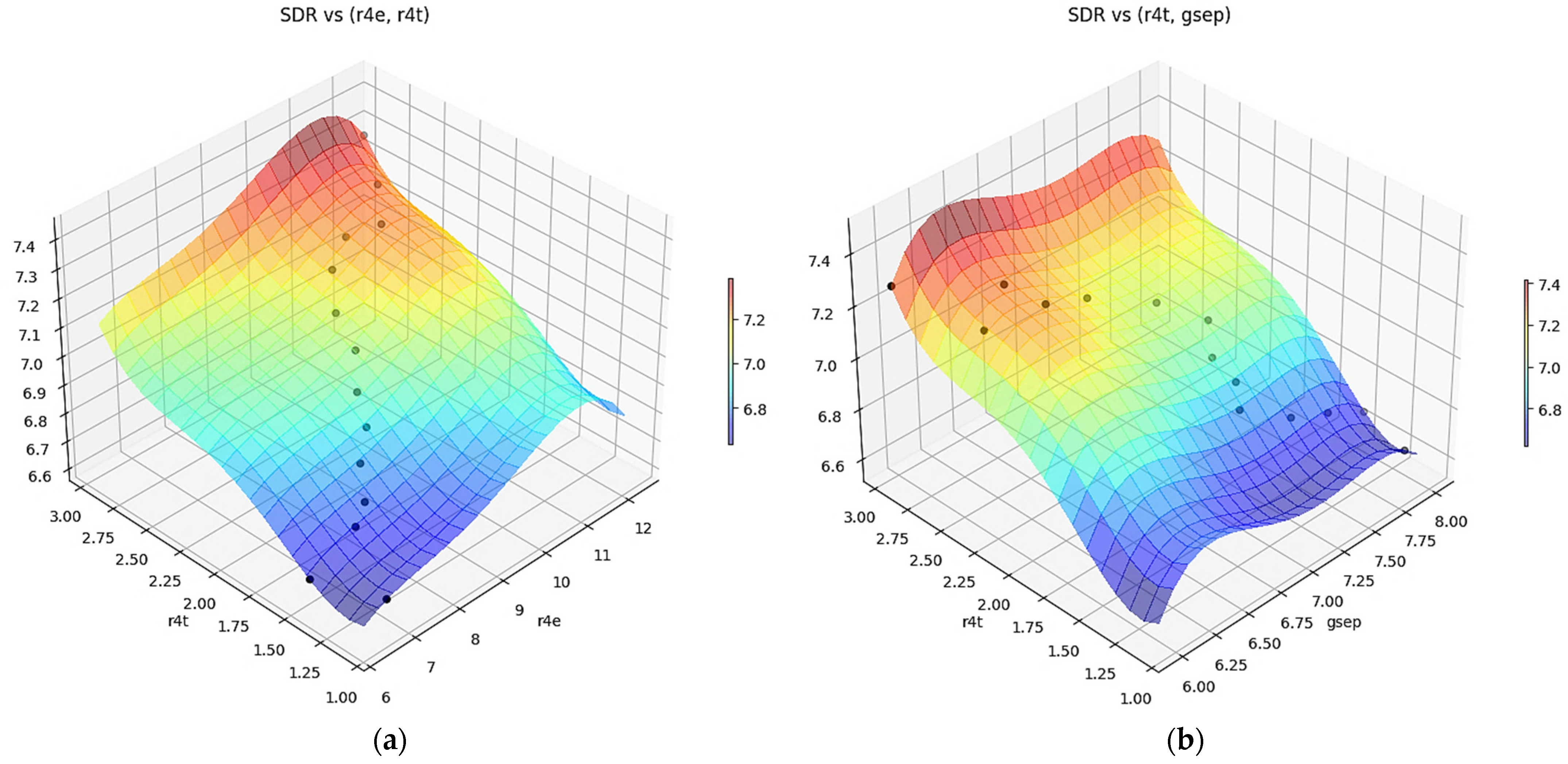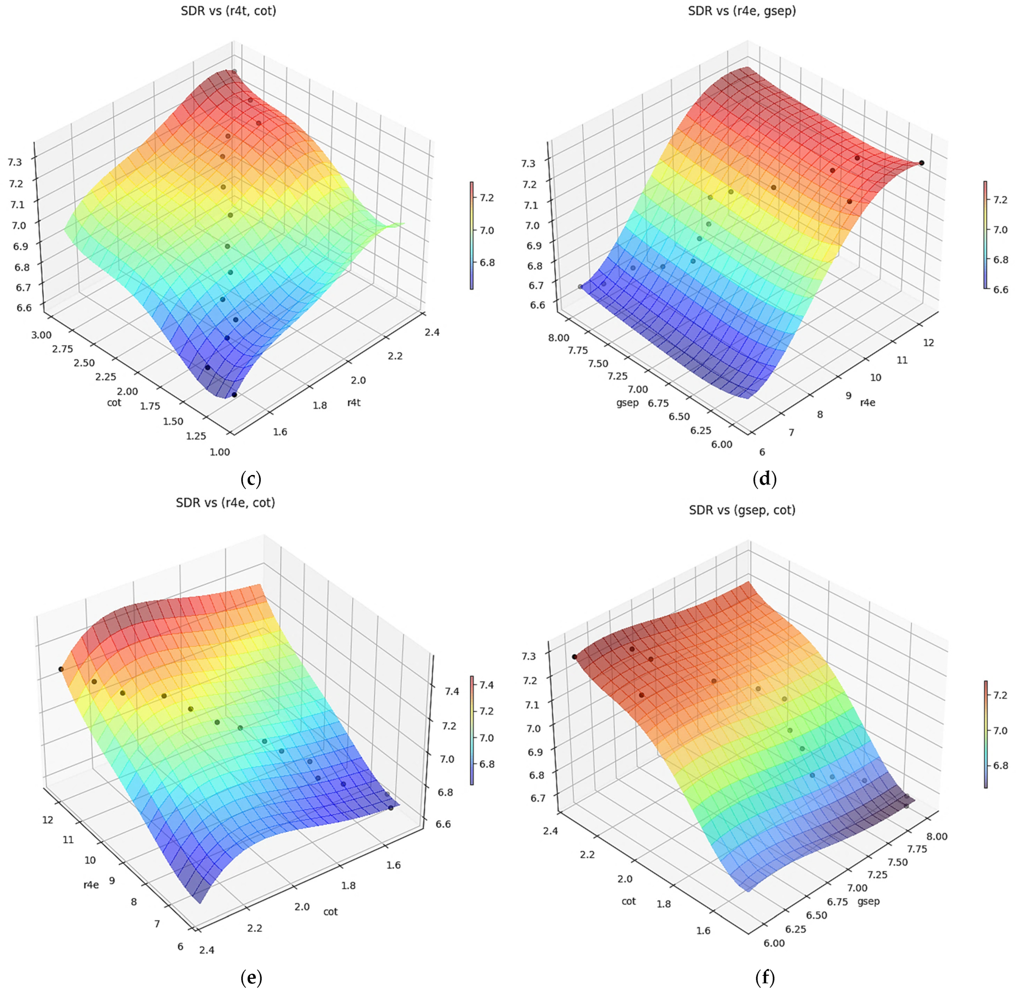 Figure 6a illustrates the surface of SDR versus r4t and r4e, showing a clear increase in SDR as both variables rise. Both r4t and r4e exert a positive and predictable correlation on the SDR.