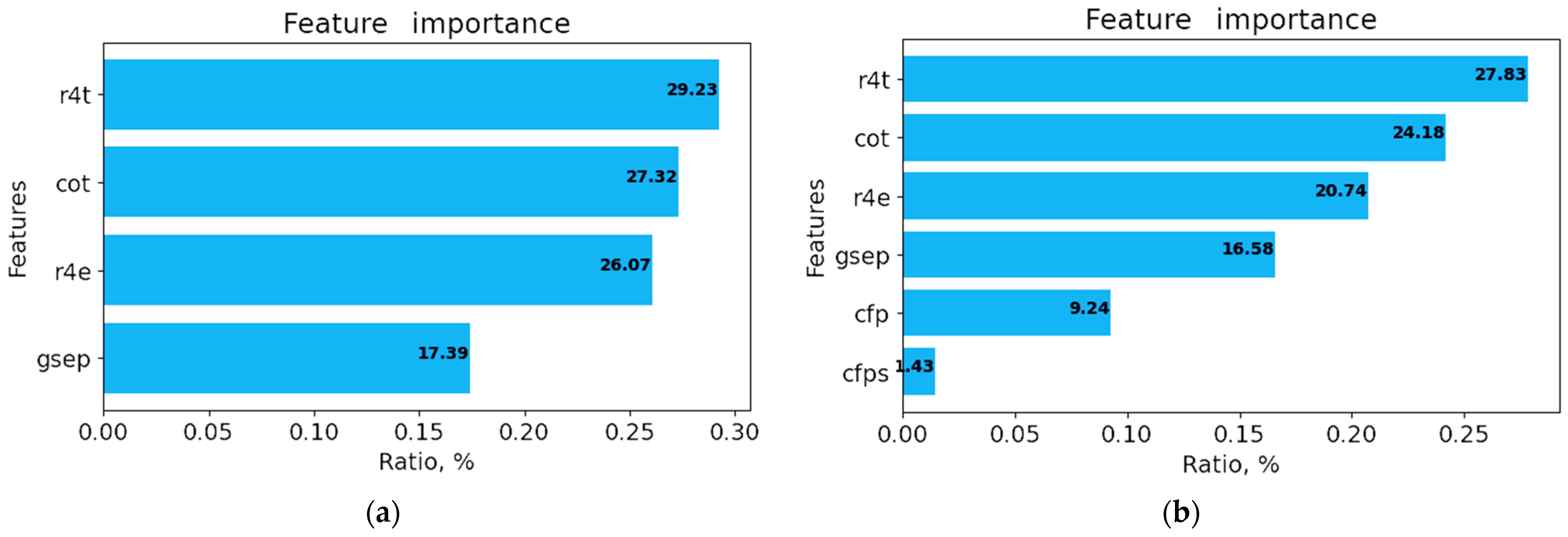 Figure 9 indicate that the hierarchy identified by the ANN remains consistent regardless of whether the full dataset or only the four-variable subset is used. Moreover, the importance values obtained for both approaches are similar, with differences of approximately six percentage points. In both cases, the most influential variable is r4t, followed by cot, then r4e, and finally gsep. Regarding percentage values, r4t consistently exceeds 25%, reaching up to 29.23%, while the remaining variables cluster near this range, except when only four variables are considered, in which case gsep shows a markedly lower value.