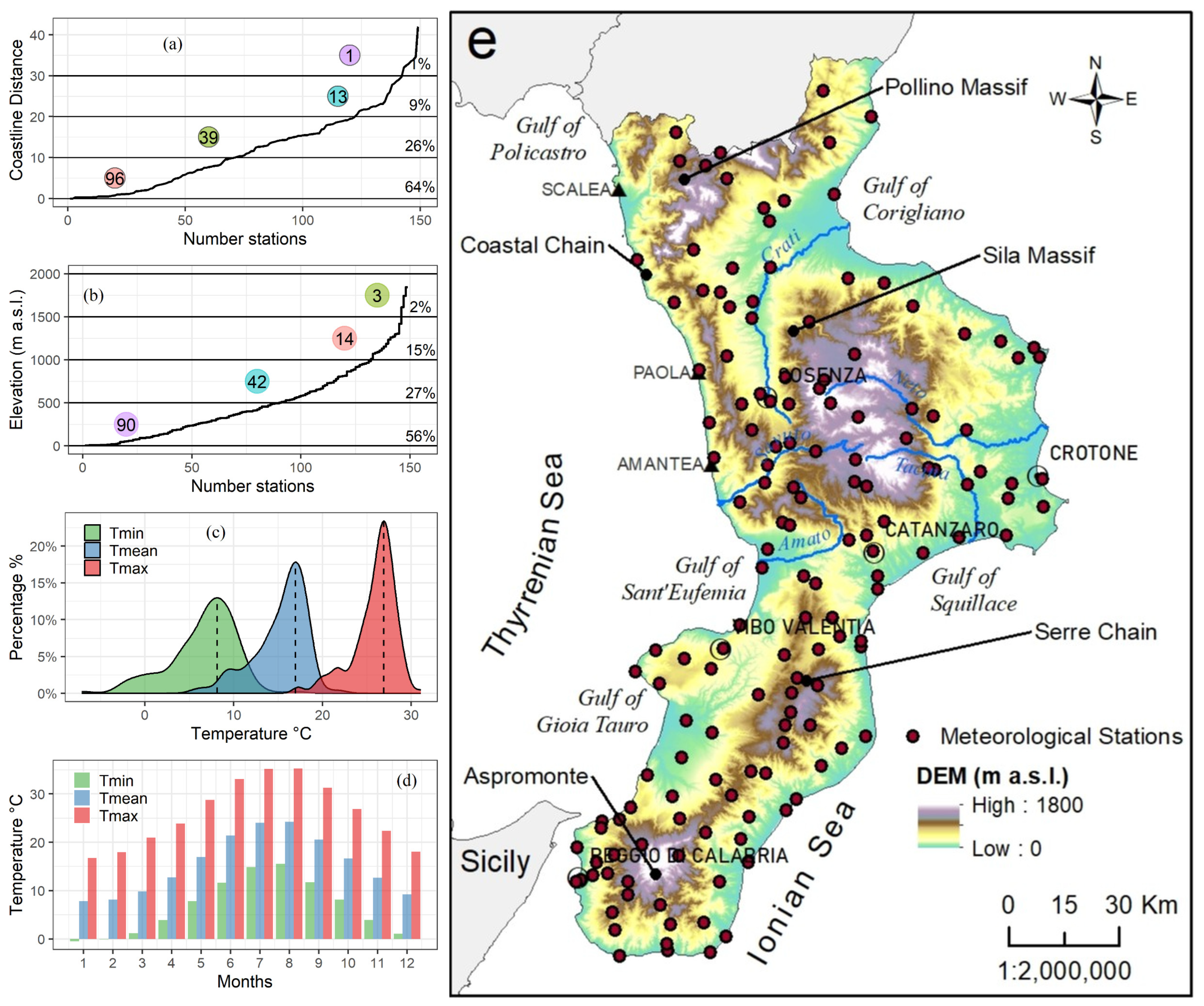 Figure 1b). In addition, considering the distance from the sea, 64% of the total stations fall within 10 km from the sea, 26% within the range 10–20 km m a.s.l., 9% between 20 and 30 km, and only 1% of the stations is far than 30 km from the sea (