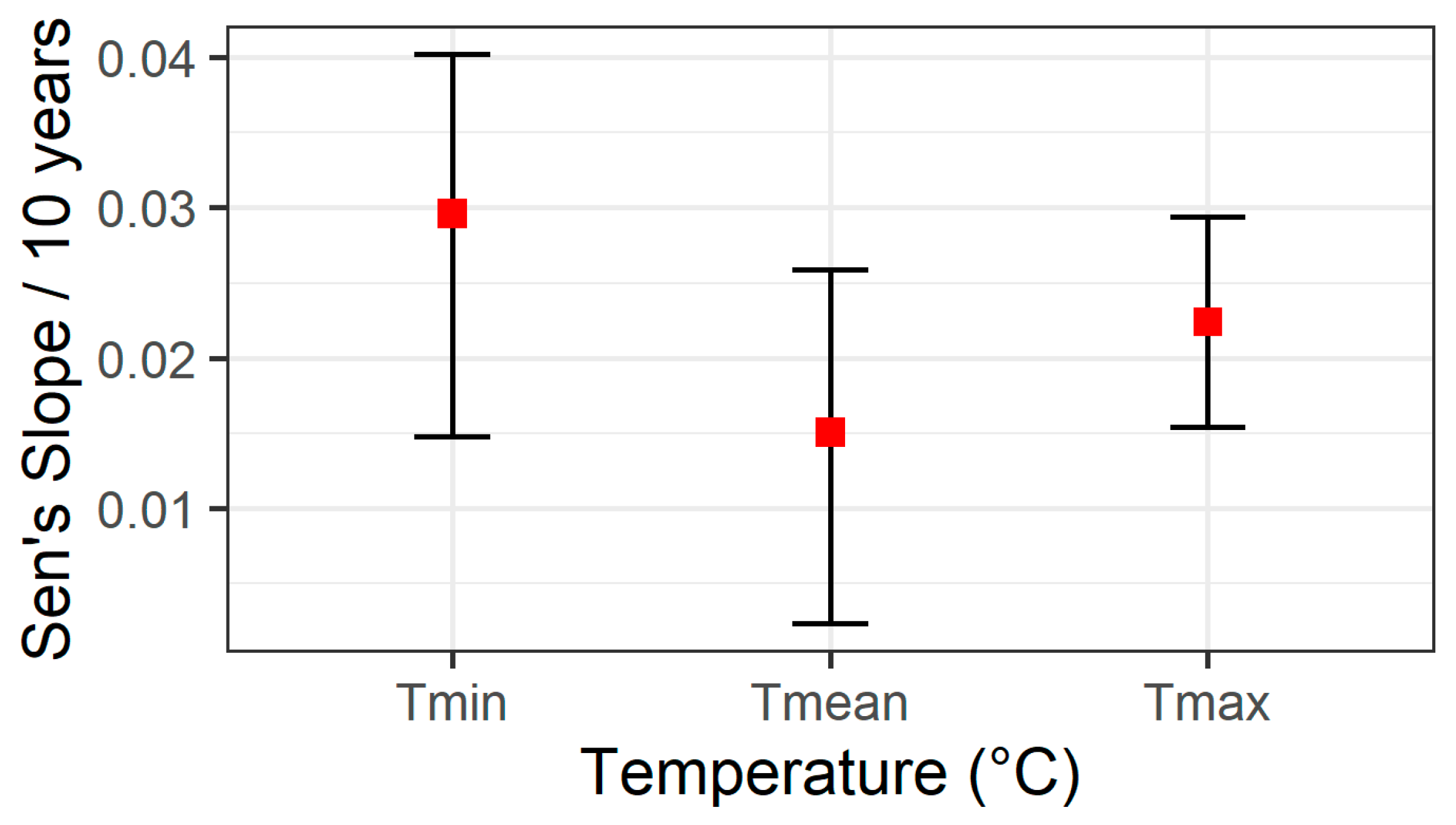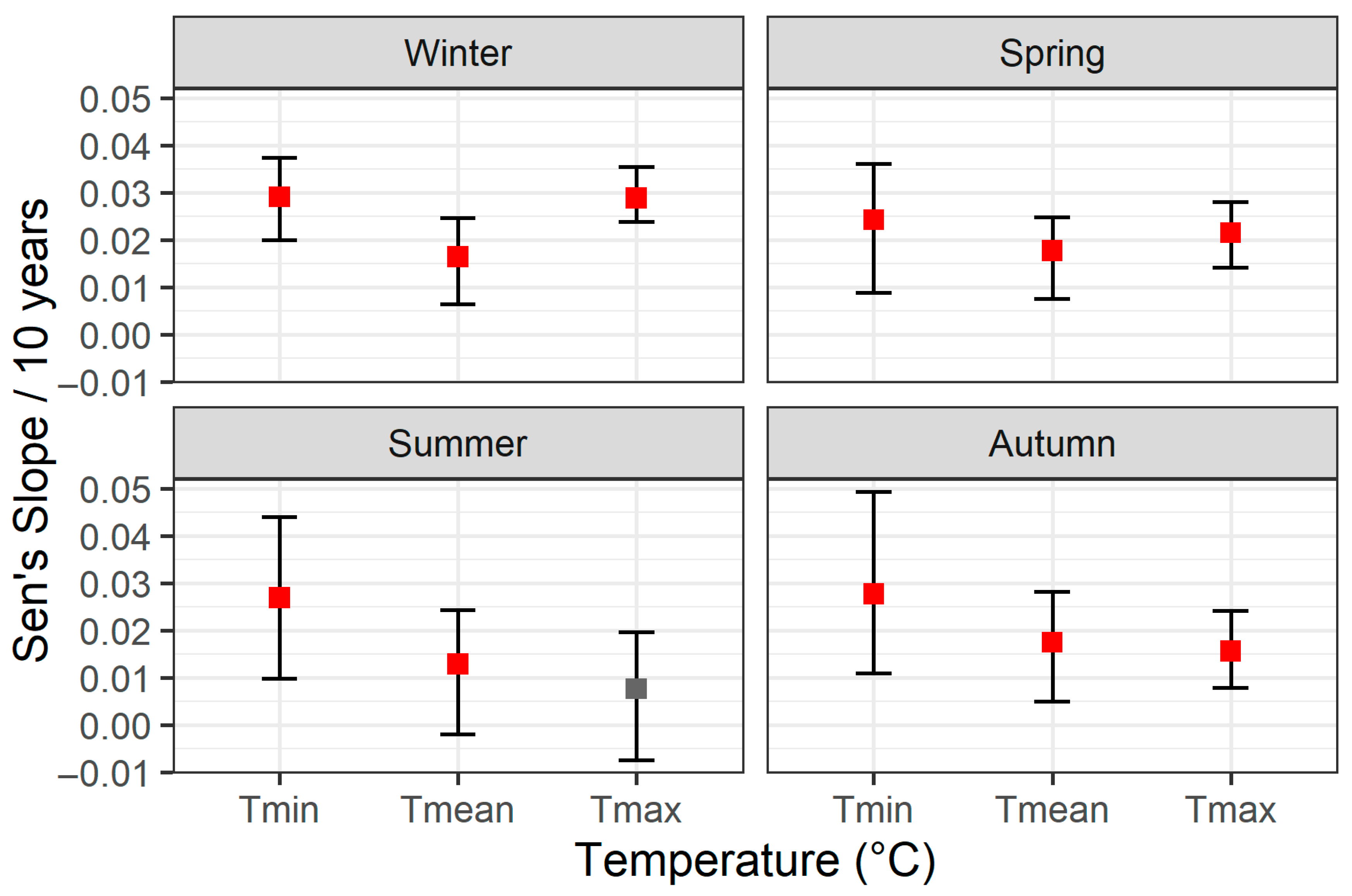 Figure 3). In that season, both Tmin (0.0291 °C/100 m/10 years) and Tmax (0.0288 °C/100 m/10 years) exhibit some of the largest slopes, pointing to a marked reduction in the vertical temperature gradient during colder months. Autumn and spring also show clear positive slopes for all three temperature measures, most notably in Tmin, where values above 0.024 °C/100 m/10 years underscore the persistent rise in lower-bound temperatures. Summer follows a similar pattern for Tmean (0.0129 °C/100 m/10 years) and Tmin (0.0269 °C/100 m/10 years), although the slope for Tmax (0.0077 °C/100 m/10 years) is not statistically significant, suggesting that the warming signal in maximum temperatures is more variable or moderated by other factors during the warm season. Taken together, these findings indicate a long-term trend toward diminished lapse rates year-round, driven especially by rising minimum temperatures, with the strongest effects emerging in winter and a less pronounced but still noteworthy signal in other seasons.