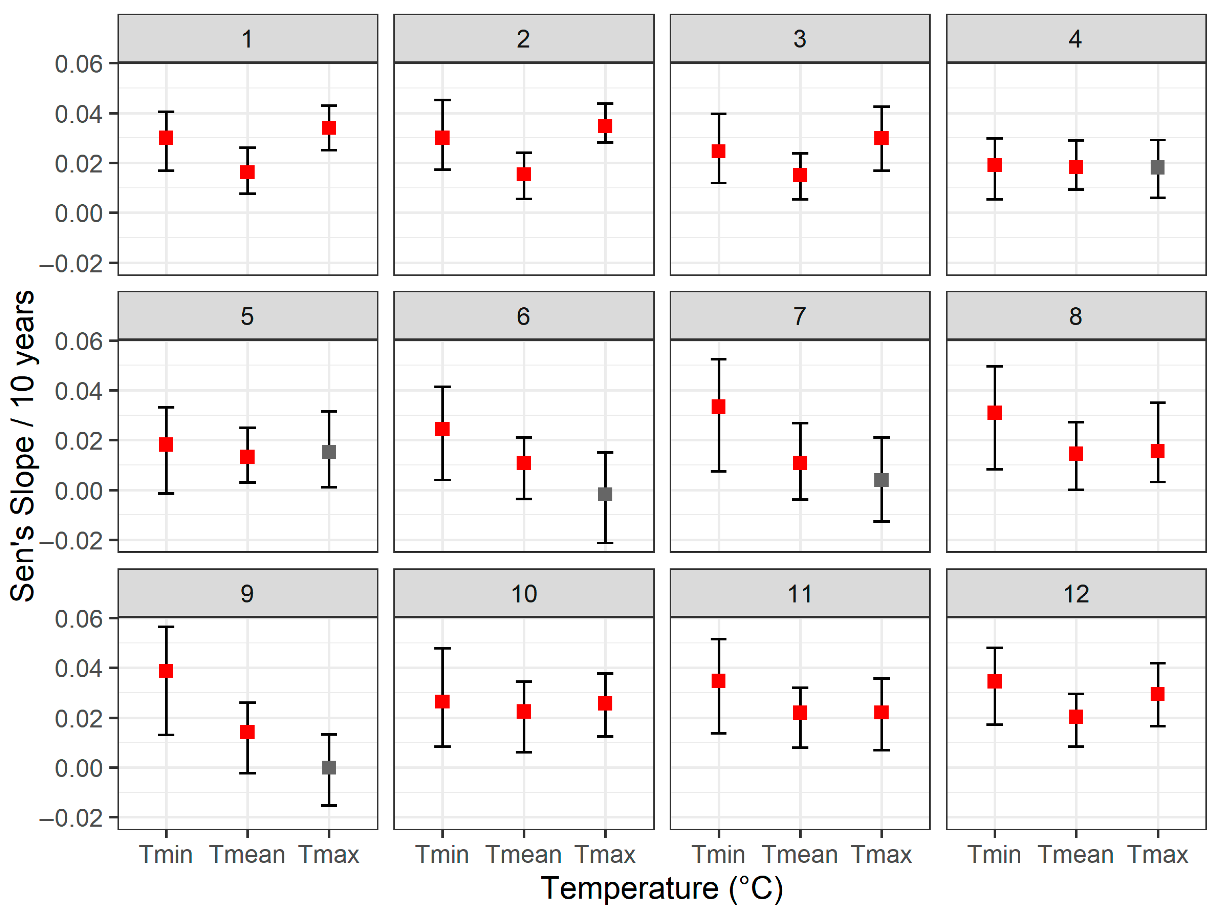 Figure 4). Tmin stands out for its consistently positive and highly significant slopes throughout the year, with especially large increases in late summer and early autumn (e.g., 0.0388 °C/100 m/10 years in September), suggesting that minimum temperatures are rising more rapidly than other metrics, and contributing substantially to the overall reduction in vertical temperature differences. In contrast, Tmax displays a more pronounced winter signal, showing robust increases in January through March (0.034–0.035 °C/100 m/10 years) and again in late autumn to early winter (October to December), while exhibiting weaker or non-significant trends during the warmer months (e.g., June, July, and September). Tmean consistently remains positive across all months but tends to register more moderate slopes compared to Tmin, with notably higher values in late autumn (0.022–0.0224 °C/100 m/10 years in October–November). Together, these patterns indicate that minimum temperatures are driving much of the year-round warming, whereas maximum temperatures experience their strongest increases in the colder months. As a result, the vertical temperature gradient appears to be diminishing more consistently and rapidly for Tmin, ultimately showing an overall trend toward narrower thermal differences across elevations.
