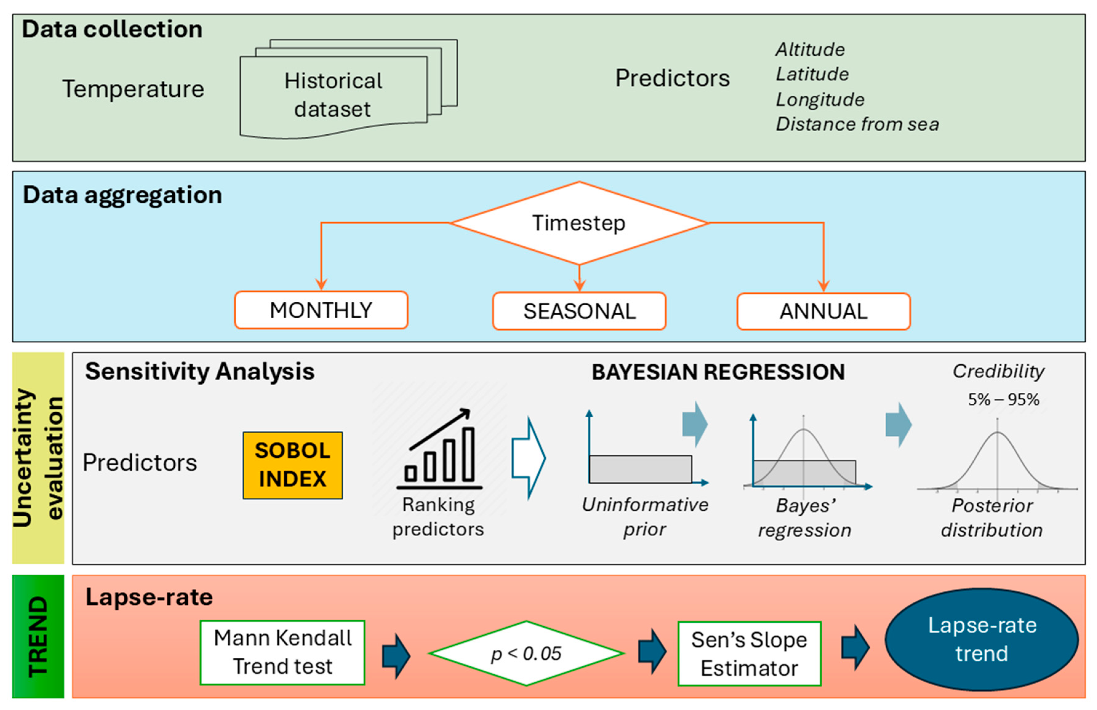 60]. For example, it should be noted that additional local factors, such as vegetation cover and slope aspect, may influence near-surface temperature gradients by altering surface energy balance and microclimatic conditions. Anyway, although these variables were not explicitly included in the present regional-scale analysis, their role could be explored in future studies using high-resolution land-cover and terrain exposure datasets. Moreover, although the Bayesian framework effectively captures uncertainties, it is still sensitive to model specifications and prior assumptions, warranting continued scrutiny and validation using multiple data sources and modelling approaches. Future studies could address these limitations by incorporating additional atmospheric variables, high-resolution reanalysis or satellite datasets, and expanded high-elevation observations. Additionally, coupling lapse rate trends with land surface changes, such as vegetation dynamics or urban expansion, could enrich the interpretation of elevation-dependent climate responses.
