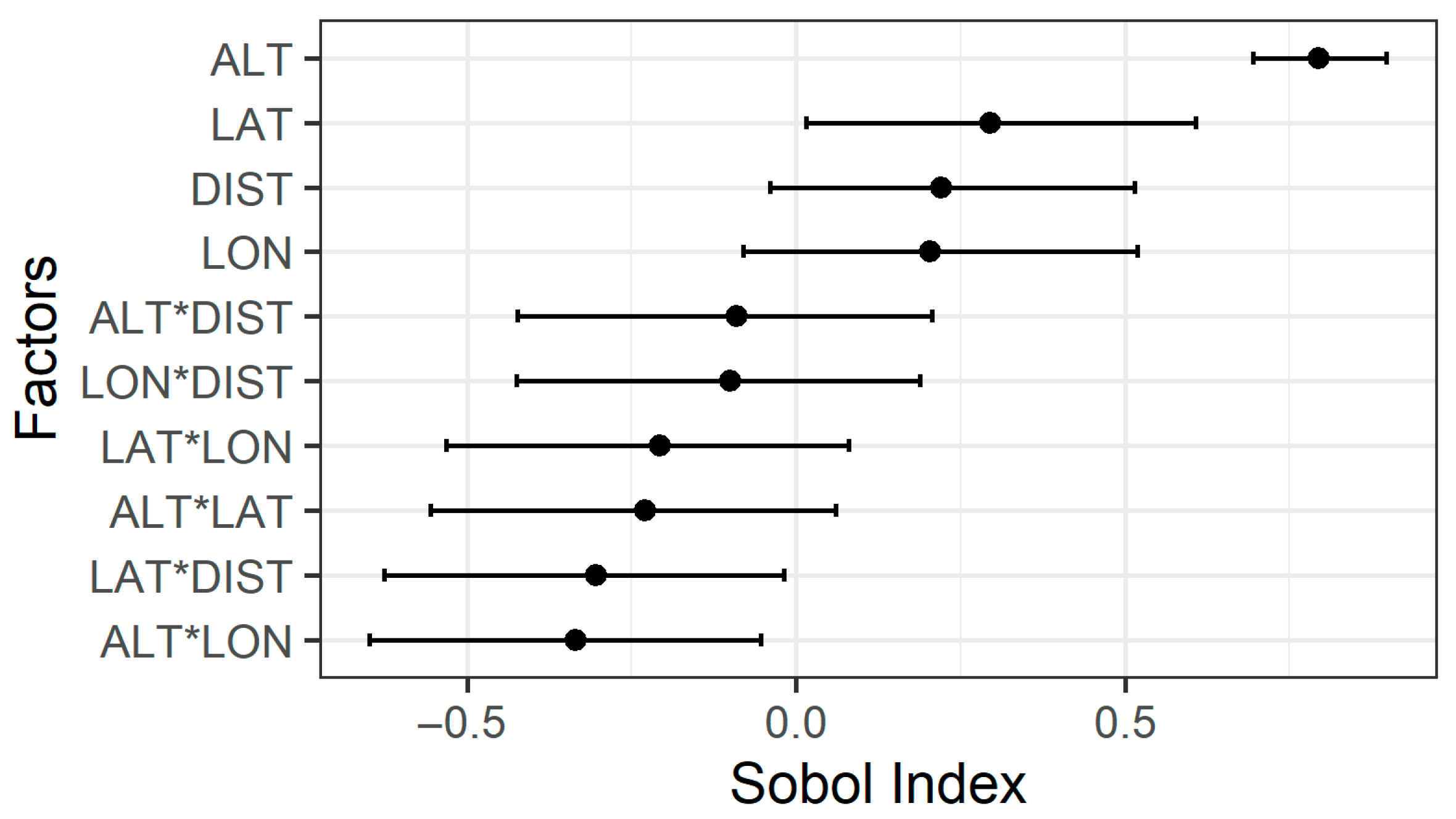 A sensitivity analysis was conducted to evaluate the influence of specific topographic and geographic features on temperature. In this study, the second-order Sobol method was employed to quantify both the contribution of individual factors and their interactions to the variability of the model’s output. Specifically, a multiple regression model was used to assess the impact of each input variable through variance decomposition.