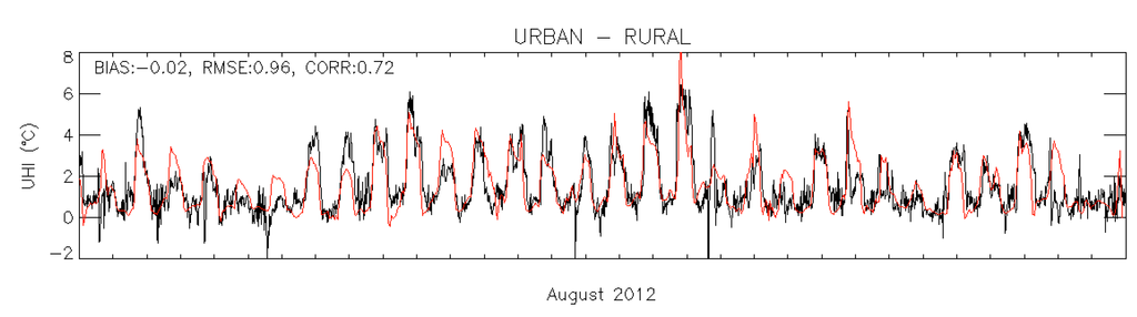 Urban-rural 2-m air temperature difference between the city center and the rural station for the measurements (black) and the UrbClim model (red), for August 2012. Error statistics (model bias, root mean square error and correlation coefficient) are given in the top left of the figure. UHI, urban heat island. The location of both stations is denoted in Figure 2.