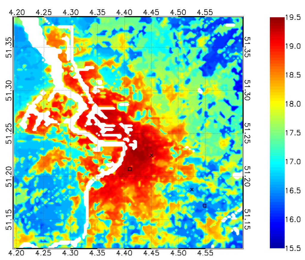 The resulting temperature indicator quantifies the heat stress in the simulated domain using the temperature during warm summer nights. More specifically, we consider the temporal 95th percentile of the minimum temperatures for the summer period, i.e., the minimum temperature that is exceeded on average 5 times each summer (considering that summer extends over the period June–August). For cities in a hilly environment, the UHI effect is often blurred by topographical effects. Therefore, all air temperatures are henceforth corrected for terrain height by rescaling them to the average city height, applying a lapse rate of 6.5 K·km−1. As an example, Figure 2 shows the resulting indicator for the city of Antwerp, based on an UrbClim simulation for the period 1986–2005.