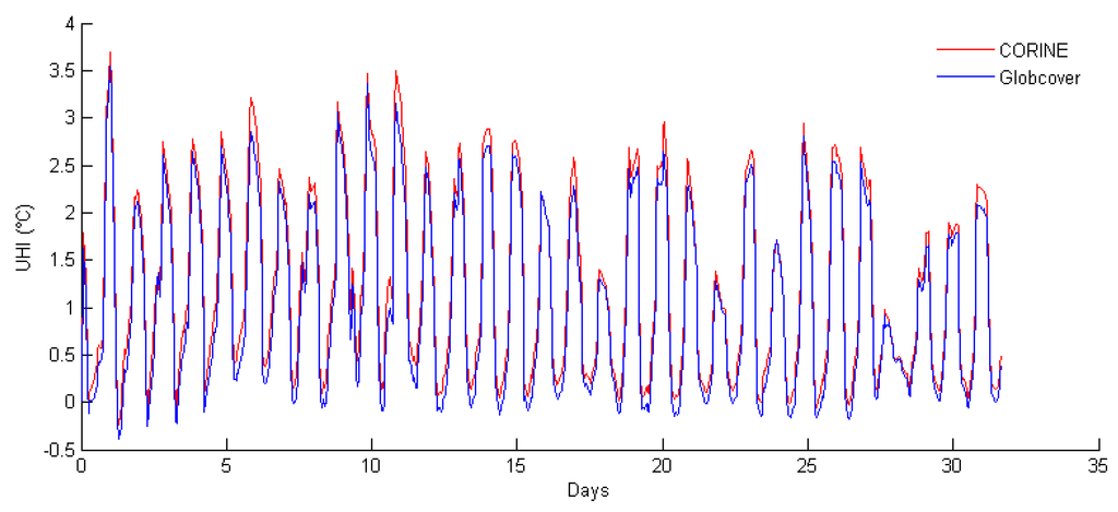 UHI intensity in Antwerp during August 2003 for the CORINE (red) and GlobCover/MODIS (blue) test simulations.