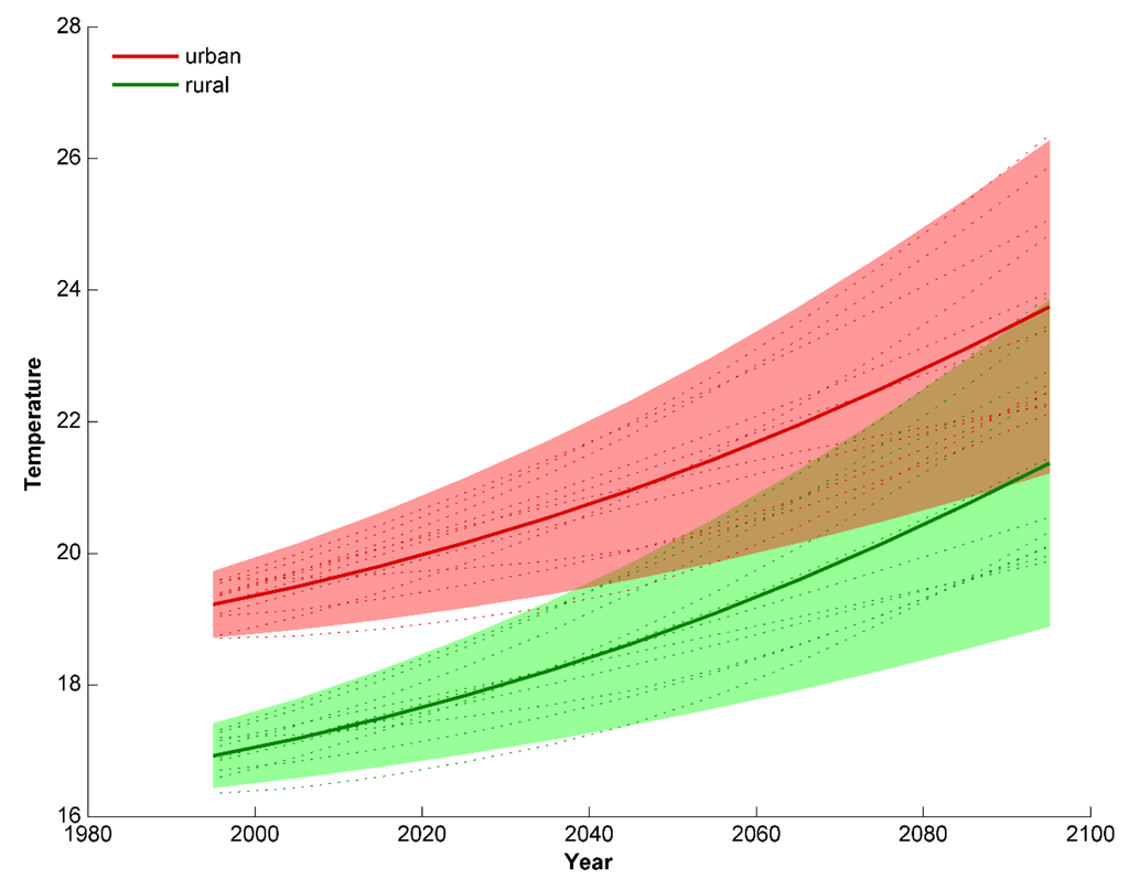 Previous reported research on this topic came to similar conclusions. Fischer et al. [5] and Oleson [6] studied the effect of several greenhouse gas scenarios on UHI intensities by the end of the century on a global scale and also found little changes in the UHI values, as the urban and rural areas showed a similar warming trend. McCarthy et al. [8] also obtained rather constant, although not static, UHI values for the cities in the United Kingdom under climate change conditions in their regional climate model simulations. Lemonsu et al. [11] and Hamdi et al. [7] reported a relatively strong decrease in the night-time UHI intensities of Paris (−1 °C) and Brussels (−0.36 °C), respectively. They could attribute these changes to a large reduction of the summer rainfall amounts by the end of the century in their simulations, strongly diminishing the evaporation from vegetation and soils in the rural areas, which gives rise to higher rural temperatures and, hence, a smaller UHI. However, only one driving GCM was used in their studies, so they could not estimate the resulting dispersion with respect to alternative global climate models.