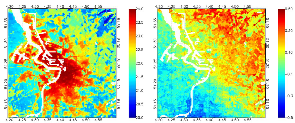 In Figure 9, the resulting map of the temperature indicator for the period 2081–2100 for the whole model domain of Antwerp is presented. When comparing Figure 9 and Figure 2, it is clear that, while the temperatures increase considerably between the current-day situation and the end-of-the-century scenario, there is no appreciable difference in the spatial patterns between the map of the temperature indicator for the reference period and the temperature indicator for the future period. The mean increase in the UHI-indicator is 0.07, with an uncertainty of ±0.07 °C. This uncertainty on the change in the UHI-indicator is calculated using the standard deviation of the UHI-indicator for both the reference period and the end-of-the-century and the standard rules for the propagation of uncertainty. The overall temperature increase is thus much larger than the increase in the UHI effect. Hence, we can conclude that the temperature increase of the background dominates the urban and rural temperature changes.