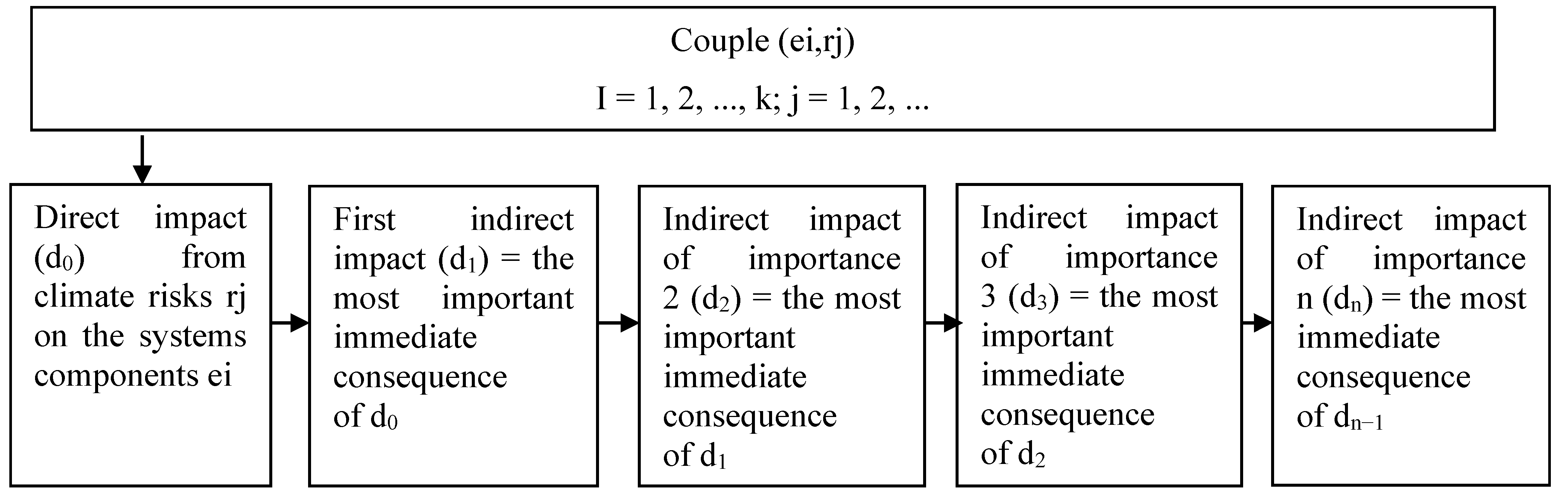 The second step of the ClimProspect approach consists of assessing direct and indirect impacts of vector R on vector ES. Practically, it is a matter of drawing an impact chain up for each couple (ei, rj), I = 1, 2, …, k et j = 1, …, p, as presented by Figure 3. To identify a given impact, the impact assessment should to be done several times in order to ensure that one does not fail. In fact, the final aim of the model is to build “no regret adaptation”. First, one identifies a set of immediate drawbacks related to environmental, economic, social, technological, human, political and institutional aspects. Second, the significant impacts are selected. Finally, to draw impact chain, these impacts are selected by order of importance.