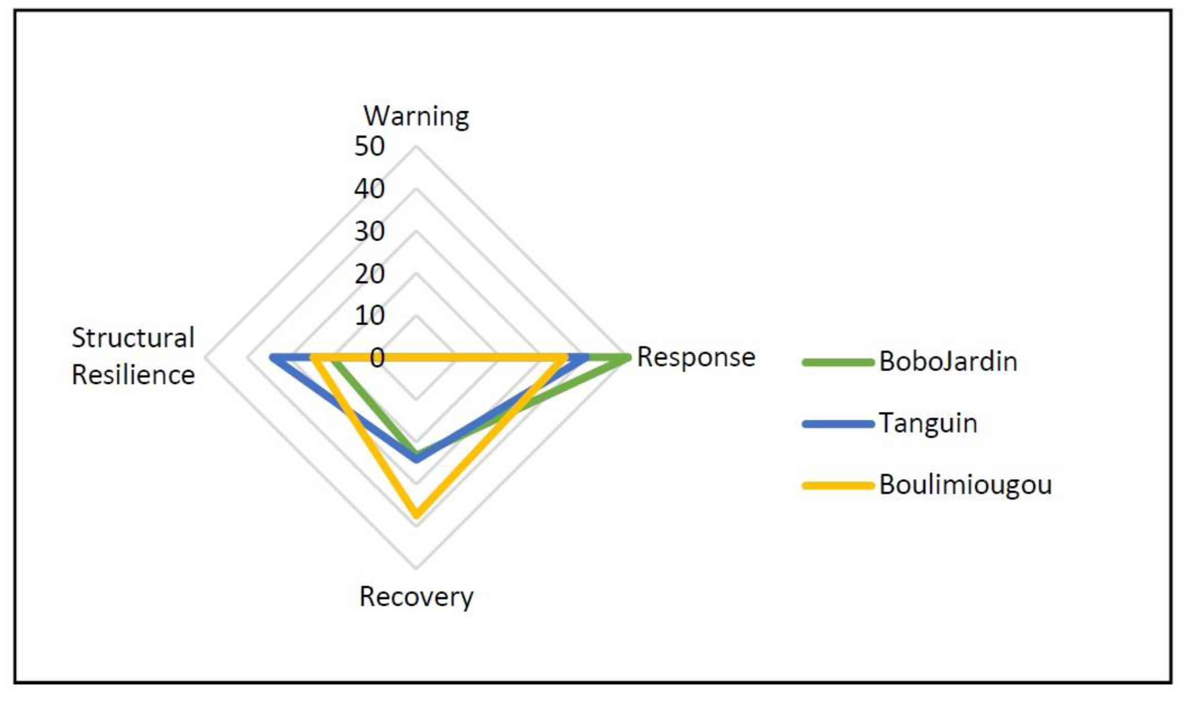 Figure 5. Agricultural water resilience to climate risks in BoboJardin, Tanguin and Boulimiougou.